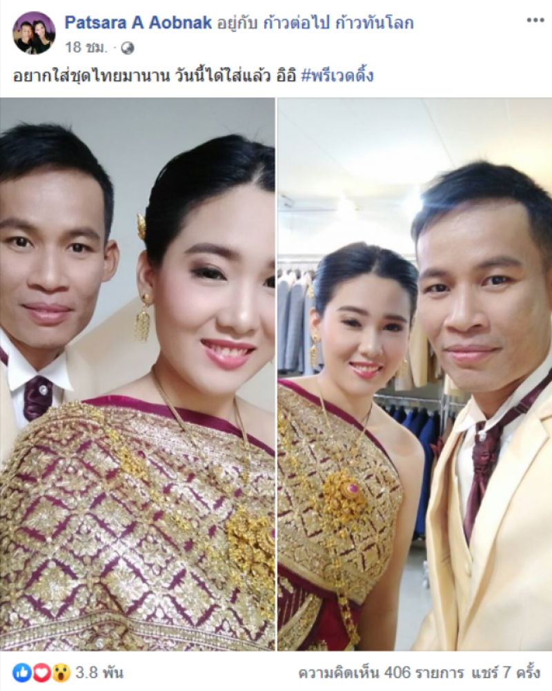 และล่าสุดน้องบีได้โพสต์ผ่านทางเฟซบุ๊กส่วนตัว Patsara A Aobnak เป็นภาพตนกับแฟนหนุ่มในชุดเจ้าบ่าวเจ้าสาวแบบชุดไทย พร้อมข้อความว่า