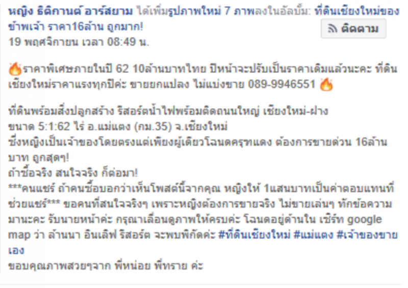 ล่าสุดก็ได้โพสต์อีกว่า คนแชร์ ถ้าคนซื้อบอกว่าเห็นโพสต์นี้จากคุณ หญิงให้ 1แสนบาทเป็นค่าตอบแทนที่ช่วยแชร์ ขอคนที่สนใจจริงๆ เพราะหญิงต้องการขายจริง ไม่ขายเล่นๆ ทักข้อความมานะคะ รับนายหน้าค่ะ กรุณาเลื่อนดูภาพให้ครบค่ะ โฉนดอยู่ด้านใน เซิร์ท google map ว่า ล้านนา อินเลิฟ รีสอร์ต จะพบพิกัดค่ะ