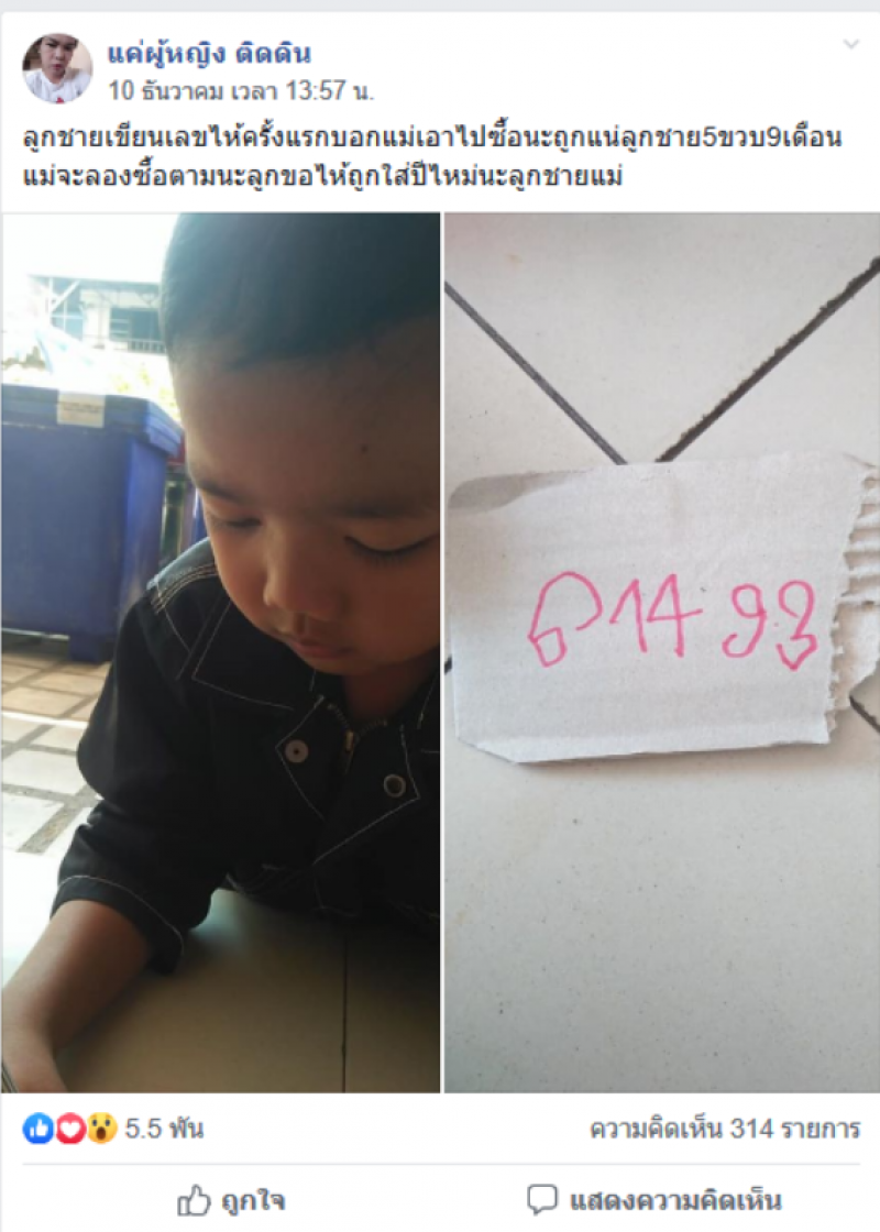 ใกล้เข้ามาทุกทีแล้วจ้า สำหรับการประกาศผลรางวัลสลากกินแบ่งรัฐบาลประจำวันที่ 16 ธันวาคม 62 ล่าสุดมีผู้ใช้เฟสบุ๊คชื่อ แค่ผู้หญิง ติดดิน ได้ออกมาโพสต์ภาพผ่านกลุ่มดัง พร้อมทั้งได้ระบุข้อความว่า บุตรชายเขียนเลขให้ครั้งแรกบอกแม่เอาไปซื้อนะถูกแน่ลูกชาย5ขวบ9เดือนแม่จะลองซื้อตามนะลูกขอให้ถูกใส่ปีไหม่นะลูกชายแม่