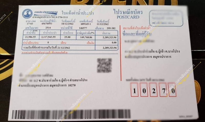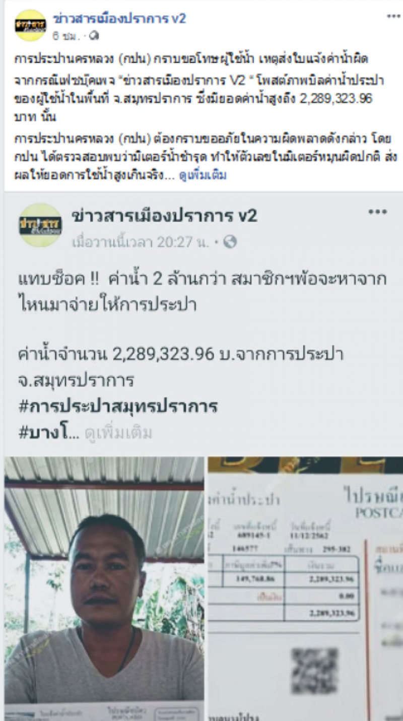 เป็นอีกหนึ่งเรื่องราวที่โซฌชียลเข้ามาแสดงความเห็นกันเป็นจำนวนมาก หลังมีผู้ใช้เฟสบุ๊คชื่อ ข่าวสารเมืองปราการ v2 ได้ออกมาโพสต์ภาพของชาวบ้านรายหนึ่ง โชว์บิลค่าน้ำที่แพงแสนแพงถึง 2 ล้านกว่าบาท ซึ่งเจ้าตัวกังวลเพราะไม่รู้จะหาเงินจากที่ไหนมาจ่าย โดยจากโพสต์นั้นได้ระบุรายละเอียดว่า แทบช็อค ค่าน้ำ 2 ล้านกว่า สมาชิกฯพ้อจะหาจากไหนมาจ่ายให้การประปา ค่าน้ำจำนวน 2289323 บาทจากการประปา จ สมุทรปราการ การประปาสมุทรปราการ บางโปรง อำเภอเมือง สมุทรปราการ