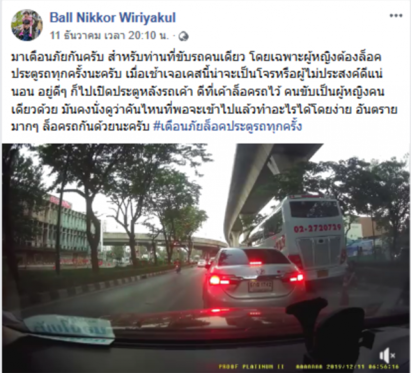 เรียกได้ว่าเป็นเรื่องราวที่มีคนต่างเข้ามาแสดงความคิดเห็นกันเป็นจำนวนมาก โดยเฟสบุ๊คที่ใช้ชื่อว่า Ball Nikkor Wiriyakul ได้โพสต์คลิปวีดีโอพร้อมข้อความเตือนภัยเอาไว้ว่า มาเตือนภัยกันครับ สำหรับท่านที่ขับรถคนเดียว โดยเฉพาะผู้หญิงต้องล็อคประตูรถทุกครั้งนะครับ เมื่อเช้าเจอเคสนี้น่าจะเป็นโจรหรือผู้ไม่ประสงค์ดีแน่นอน อยู่ดีๆ ก็ไปเปิดประตูหลังรถเค้า ดีที่เค้าล็อครถไว้ คนขับเป็นผู้หญิงคนเดียวด้วย มันคงนั่งดูว่าคันไหนที่พอจะเข้าไปแล้วทำอะไรได้โดยง่าย อันตรายมากๆ ล็อครถกันด้วยนะครับ เตือนภัยล็อคประตูรถทุกครั้ง