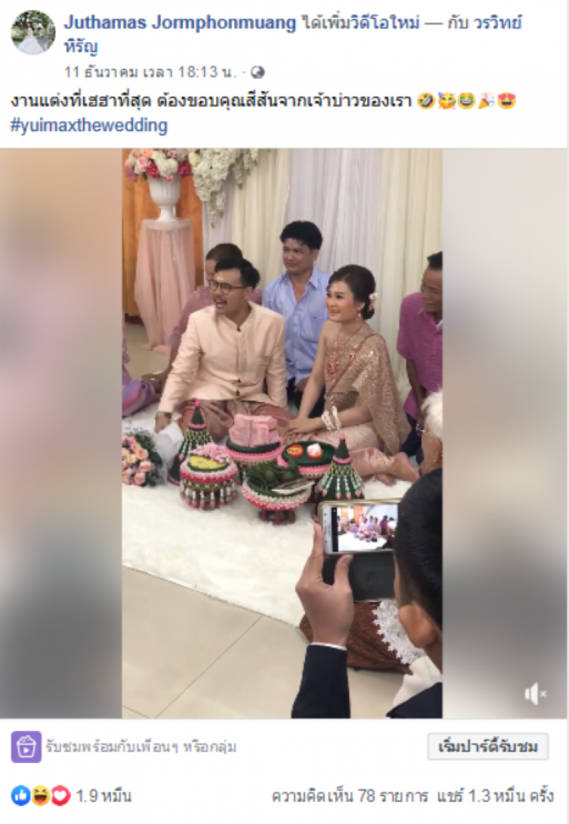 เรียกได้ว่าเป็นอีกหนึ่งเรื่องราวที่โซเชียลเข้ามาแสดงความคิดเห็นกันเป็นจำนวนมาก หลังมีผู้ใช้เฟสบุ๊คชื่อ Juthamas Jormphonmuang ได้ออกมาโพสต์คลิปผ่านเฟสบุ๊คส่วนตัว โดยได้ระบุข้อความว่า งานแต่งที่เฮฮาที่สุด ต้องขอบคุณสีสันจากเจ้าบ่าวของเรา โดยคลิปดังกล่าวบรรยากาศงานแต่งคู่รักคู่หนึ่ง โดยมีเพื่อนเจ้าบ่าว ที่กลังแซว จ้าบ่าวเองก็เป็นคนสายฮา ตบมุกได้ดีตลอด ทำเอาคนฮากันทั้งงานเลยจ้า