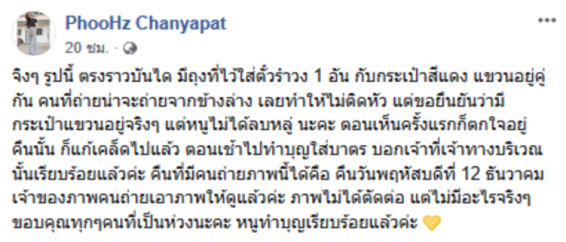 ล่าสุด เฟซบุ๊ก PhooHz Chanyapat โพสต์ข้อความระบุว่า จริงๆ รูปนี้ ตรงราวบันได มีถุงที่ไว้ใส่ตั๋วรำวง 1 อัน กับกระเป๋าสีแดง แขวนอยู่คู่กัน คนที่ถ่ายน่าจะถ่ายจากข้างล่าง เลยทำให้ไม่ติดหัว แต่ขอยืนยันว่ามีกระเป๋าแขวนอยู่จริงๆ แต่หนูไม่ได้ลบหลู่ นะคะ ตอนเห็นครั้งแรกก็ตกใจอยู่ คืนนั้น ก็แก้เคล็ดไปแล้ว ตอนเช้าไปทำบุญใส่บาตร บอกเจ้าที่เจ้าทางบริเวณนั้นเรียบร้อยแล้วค่ะ คืนที่มีคนถ่ายภาพนี้ได้คือ คืนวันพฤหัสบดีที่ 12 ธันวาคม เจ้าของภาพคนถ่ายเอาภาพให้ดูแล้วค่ะ ภาพไม่ได้ตัดต่อ แต่ไม่มีอะไรจริงๆ ขอบคุณทุกๆคนที่เป็นห่วงนะคะ หนูทำบุญเรียบร้อยแล้วค่ะ