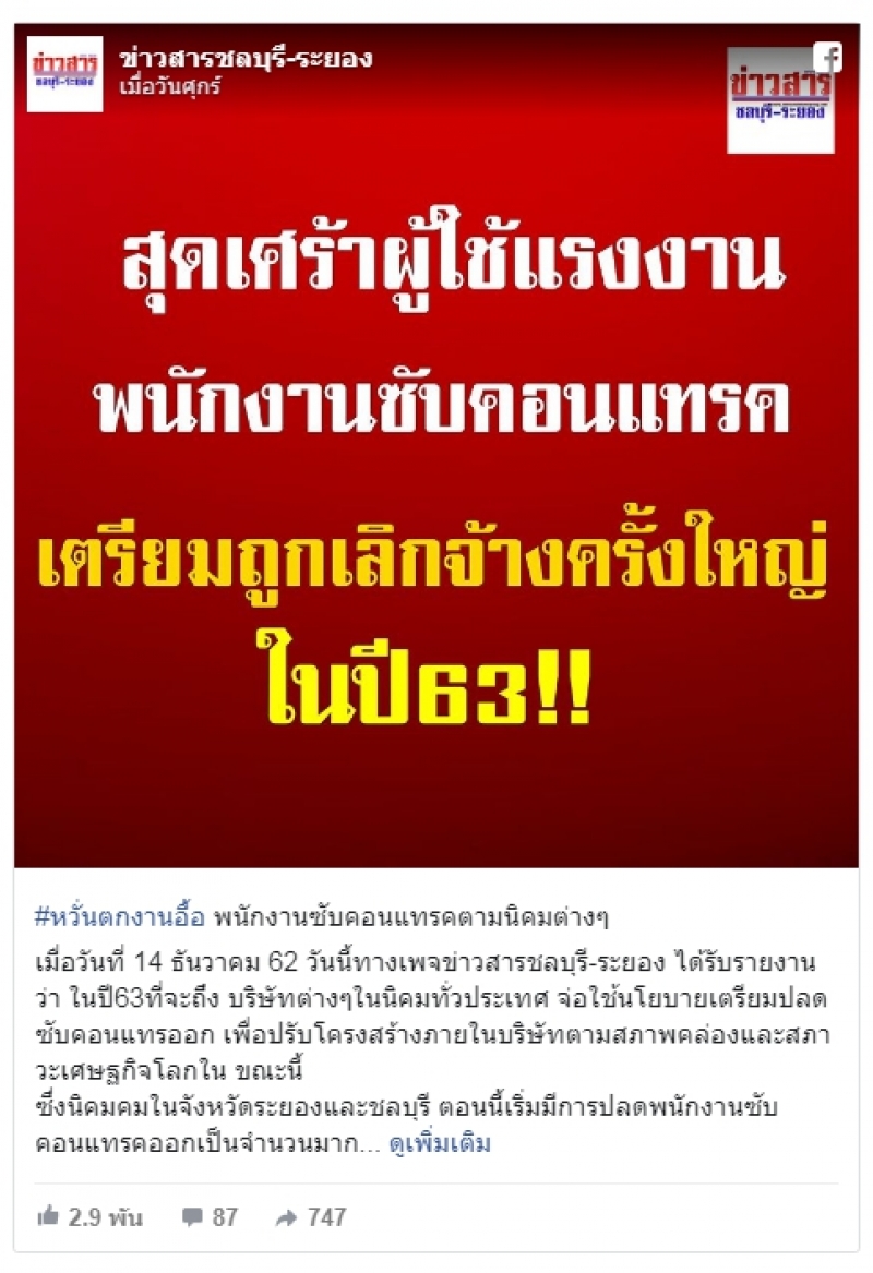 ซึ่งนิคมคมในจังหวัดระยองและชลบุรี ตอนนี้เริ่มมีการปลดพนักงานซับคอนแทรคออกเป็นจำนวนมาก ทั้งนี้ ทางเพจ ข่าวสารชลบุรี ระยองระบุว่า ข้อมูลได้รับการยืนยันว่าเป็นความจริง ทำให้ในขณะนี้พี่น้องชาวแรงงานต่างเป็นกังวลเพราะไม่รู้เลยว่าจะเป็นตนเองหรือไม่ที่จะได้รับผลกระทบ