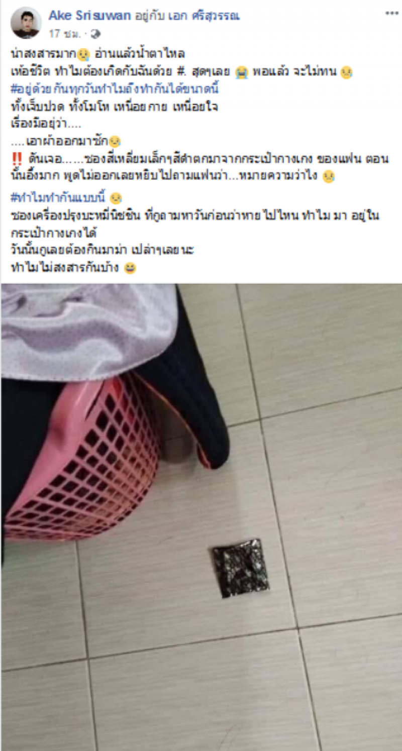 เรียกได้ว่าเป็นอีกหนึ่งเรื่องราวที่โซเชียลเข้ามาแสดงความเห็นกันเยอะมากๆ หลังมีผู้ใช้เฟสบุ๊คชื่อ Ake Srisuwan ได้ออกมาโพสต์เรื่องราว โดยได้ระบุข้อความว่า สงสาร ผู้หญิงคนนี้มาก อ่านเเล้วน้ำตาไหล เห้อชีวิต ทำไมต้องเกิดกับฉันด้วย สุดๆเลย พอแล้ว จะไม่ทน อยู่ด้วยกันทุกวันทำไมถึงทำกันได้ขนาดนี้ ทั้งเจ็บปวด ทั้งโมโห เหนื่อยกาย เหนื่อยใจ เรื่องมีอยู่ว่า เอาผ้าออกมาซัก ดันเจอซองสี่เหลี่ยมเล็กๆสีดำตกมาจากกระเป๋ากางเกง ของแฟน ตอนนั้นอึ้งมาก พูดไม่ออกเลยหยิบไปถามแฟนว่าหมายความว่าไง ทำไมทำกันแบบนี้ ซองเครื่องปรุงบะหมี่นิชชิน ที่กูถามหาวันก่อนว่าหายไปไหน ทำไมมา อยู่ในกระเป๋ากางเกงได้ วันนั้นกูเลยต้องกินมาม่า เปล่าๆเลยนะ ทำไมไม่สงสารกันบ้าง
