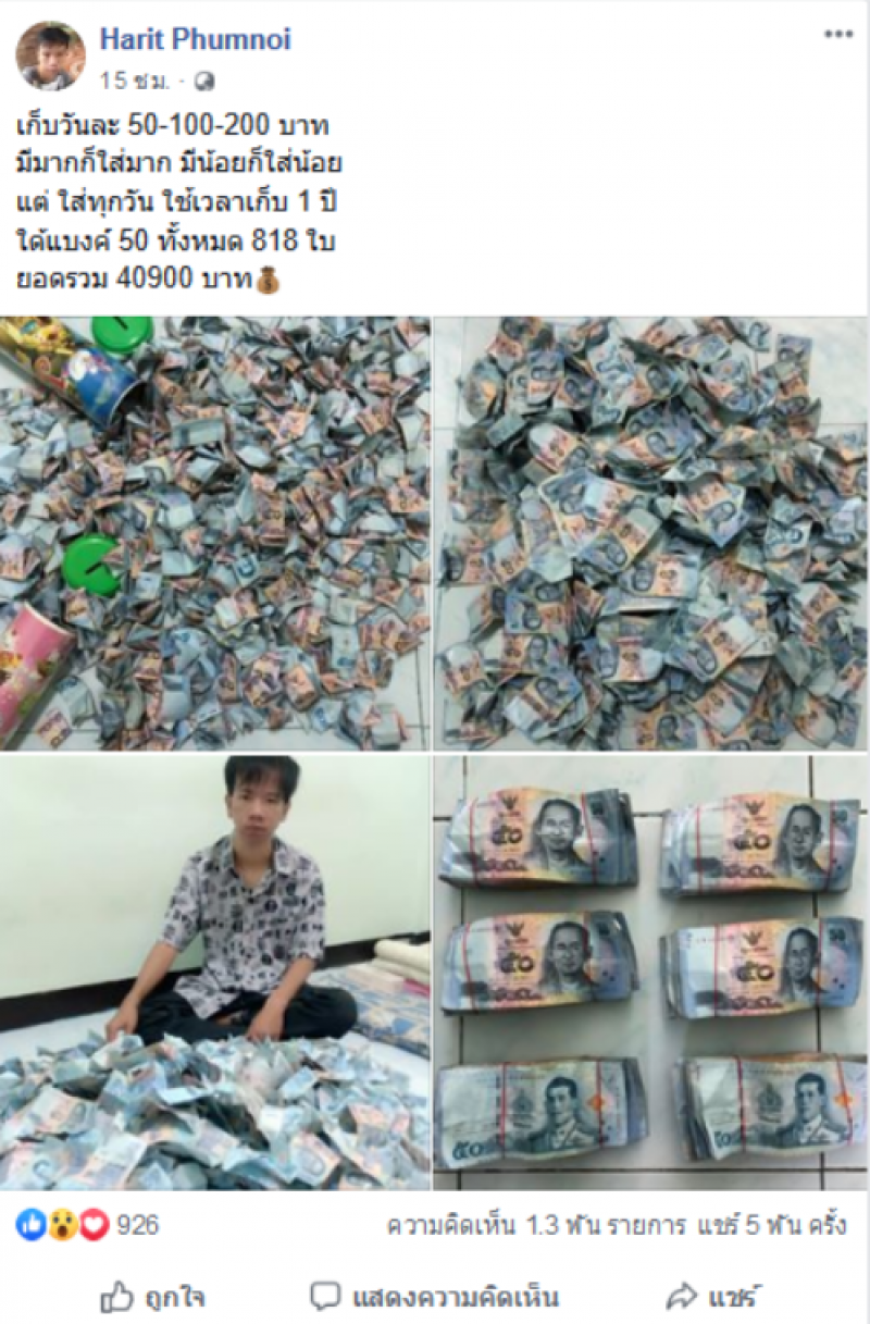 เรียกได้ว่าเป็นอีกหนึ่งเรื่องราวที่หลายๆคนเข้ามาแสดงความเห็นกันเป็นจำนวนมาก หลังมีผู้ใช้เฟสบุ๊คชื่อ Harit Phumnoi ได้ออกมาโพสต์ภาพวิธีเก็บเงินโดยหนุ่มคนดังกล่าวได้เก็บเงินแบงค์ 50 เป็นเวลา 1 ปี งานนี้ต้องบอกเงยว่าได้เยอะมากๆ มีเงินก้อนไว้ใช้ได้สบายๆเลย ทั้งนี้ยังได้ระบุข้อความว่า