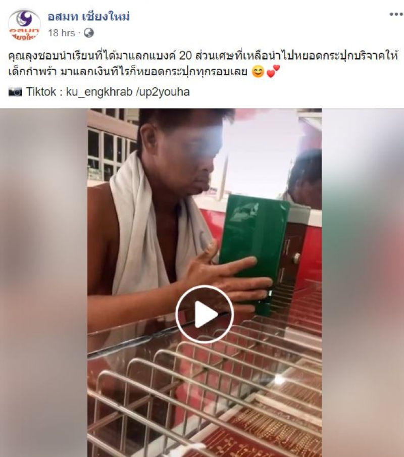 เรียกได้ว่าเป็นอีกหนึ่งเรื่องราวที่โซเชียลเข้ามาแสดงความเห็นกันเป็นจำนวนมาก หลังเพจ อสมท เชียงใหม่ ได้เผยคลิปอันสุดประทับใจ จากทางเเอพพลิเคชั่น Tiktok ของ kuengkhrab พร้อมข้อความ ชายคนนี้ชอบนำเหรียญที่ได้มาแลกแบงค์ 20 ส่วนเศษที่เหลือนำไปหยอดกระปุกบริจาคให้น้องๆกำพร้า มาแลกเงินทีไรก็หยอดกระปุกทุกรอบเลย