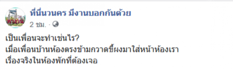 เชื่อว่าหลายๆคนมาทำงานต่างจังหวัดก็ต้องจำเป็นต้องหาหอพักดีๆสักที่ แต่การอยู่หอพักเราไม่ได้อยู่แค่คนเดียวยังมีเพื่อนข้างๆห้อง ที่เราต้องให้ความเกรงใจ ไม่ว่าจะเป็นการส่งเสียงดังหรือความสะอาด เมื่อวันที่ 20 ธันวาคม เพจ ที่นี่นวนคร มีงานบอกกันด้วย ได้โพสต์ข้อความระบุว่า เป็นเพื่อนจะทำเช่นไร เมื่อเพื่อนบ้านห้องตรงข้ามกวาดขี้ผงมาใส่หน้าห้องเรา เรื่องจริงในห้องพักที่ต้องเจอ