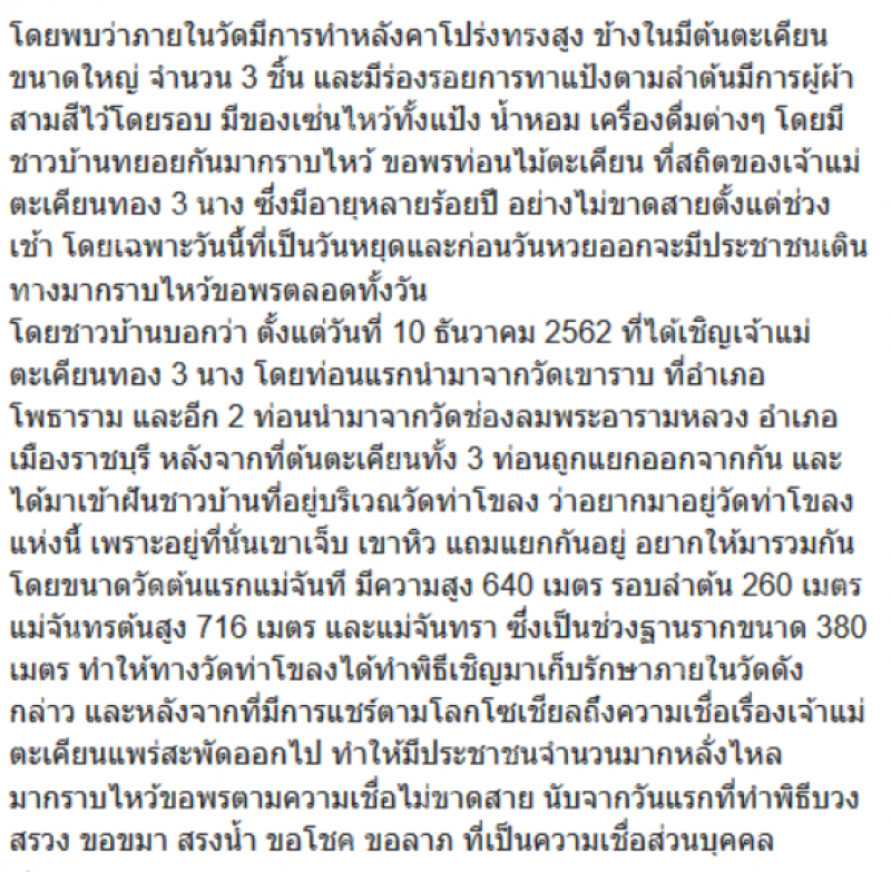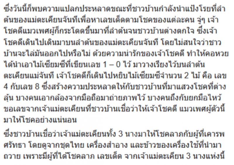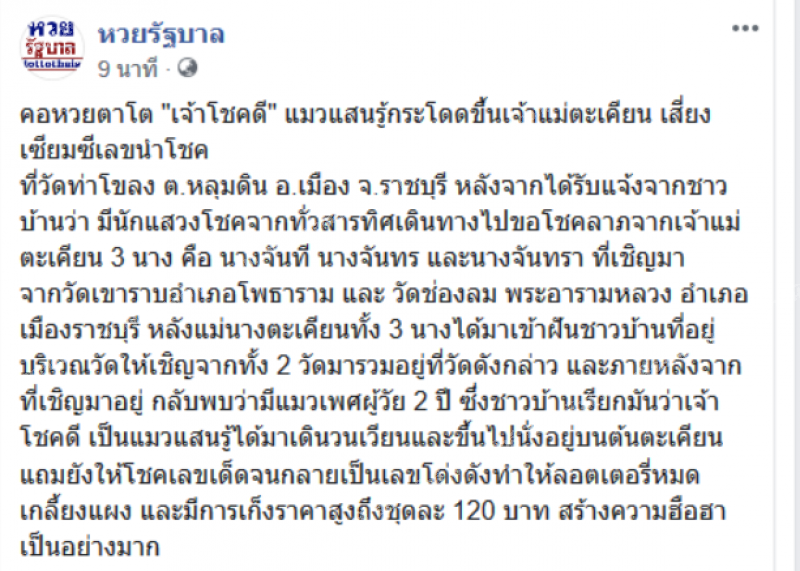 เมื่อวันที่ 20 ธันวาคม เพจ เลขรัฐบาล ได้โพสต์ข้อความระบุว่า แมวแสนรู้กระโดดศาลขึ้นเจ้าแม่ตะเคียน ที่วัดท่าโขลง ต หลุมดิน อ เมือง จ ราชบุรี หลังจากได้รับแจ้งจากชาวบ้านว่า จากทั่วสารทิศเดินทางไปขอเลข แมวแสนรู้ได้มาเดินวนเวียนและขึ้นไปนั่งอยู่บนต้นตะเคียนแถมยังให้เลขถูก จนกลายเป็นเลขโด่งดังทำให้ล็อตเตอรี่หมดเกลี้ยงแผง และมีการเก็งราคาสูงถึงชุดละ 120 บาท สร้างความฮือฮาเป็นอย่างมาก