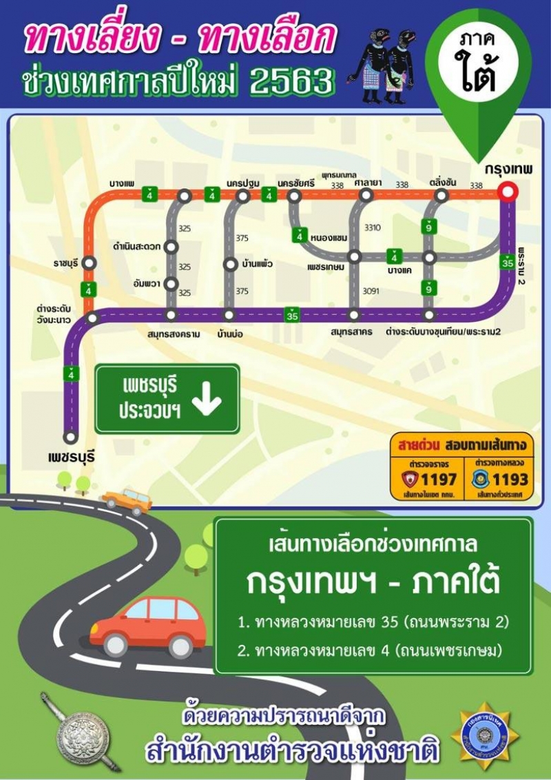 สำนักงานตำรวจแห่งชาติได้จัดทำ อินโฟกราฟิกแนะนำเส้นทางเลี่ยง ทางเลือก รวบรวมแผนที่การเดินทางใน ภาคเหนือ ภาคใต้ ภาคตะวันออก ภาคอีสาน รวมทั้งเบอร์โทรฉุกเฉิน และข้อควรปฏิบัติในการเดินทาง พร้อมทั้งมาตรการ การเตือนภัยต่างๆให้กับประชาชน