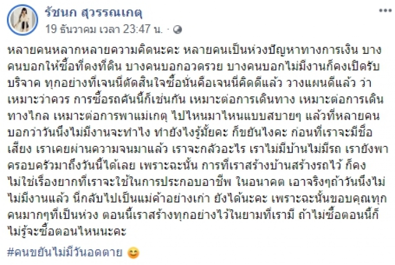 แล้วที่หลายคนบอกว่าวันนึงไม่มีงานจะทำไง ทำยังไงรู้มั้ยคะ ก็ขยันไงคะ ก่อนที่เราจะมีชื่อเสียง เราเคยผ่านความจนมาแล้ว เราจะกลัวอะไร เราไม่มีบ้านไม่มีรถ เรายังพาครอบครัวมาถึงวันนี้ได้เลย เพราะฉะนั้น การที่เราสร้างบ้านสร้างรถไว้ ก็คงไม่ใช่เรื่องยากที่เราจะใช้ในการประกอบอาชีพ ในอนาคต เอาจริงๆถ้าวันนึงไม่ไม่มีงานแล้ว นี่กลับไปเป็นแม่ค้าอย่างเก่า ยังได้นะคะ เพราะฉะนั้นขอบคุณทุกคนมากๆที่เป็นห่วง ตอนนี้เราสร้างทุกอย่างไว้ในยามที่เรามี ถ้าไม่ซื้อตอนนี้ก็ไม่รู้จะซื้อตอนไหนนะคะ