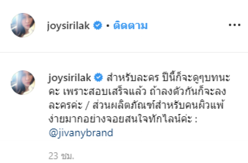 เชื่อว่าหลายๆคนคคงรู้จักและยังจำกันได้เป้นอย่างดี สำหรับดาราสาว จอย ศิริลักษณ์ ที่ต้องบอกเลยว่า หายหน้าหายตาจากหน้าจอไปนานเลยทีเดียว ทำเอาแฟนๆอดคิดถึงไม่ได้ ล่าสุดแฟนคลับเฮ หลังสาวจอย ได้ออกมาปนะกาศข่าวดีผ่านไอจีว่าตอนนี้เธอกำลังเลือกดูบทเพราะกำลังจะลงละครในปีหน้าให้แฟนๆได้ชมหลังห่างงานในวงการบันเทิงไปพักใหญ่ สำหรับละคร ปีนี้ก็จะดูๆบทนะคะ เพราะสอบเสร็จแล้ว ถ้าลงตัวกันก็จะลงละครค่ะ