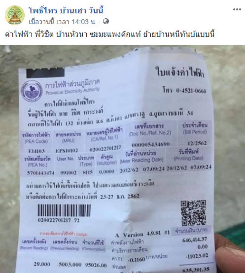 โผล่อีกแล้ว เจ้าของบ้านเจอบิลค่าไฟ