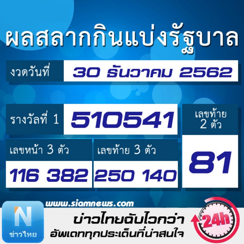 ออกไปเป็นที่เรียบร้อยแล้วสำหรับการประกาศรางวัลประจำวันที่ 30 ธันวาคม 2562 โดยในที่สุด นักแสดงรุ่นใหญ่หัวใจอาสา บิณฑ์ บรรลือฤทธิ์ ก็ให้เลขถูกแฟนๆ สมใจแล้ว หลังเลขท้าย 2 ตัว ของรถยนต์กระบะ หมายเลขทะเบียน ร 9481 กรุงเทพมหานคร ของเขา ได้ไปตรงกับรางวัลเลขท้าย 2 ตัว หมายเลขที่ออก 81 แบบพอดี