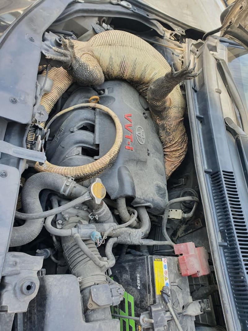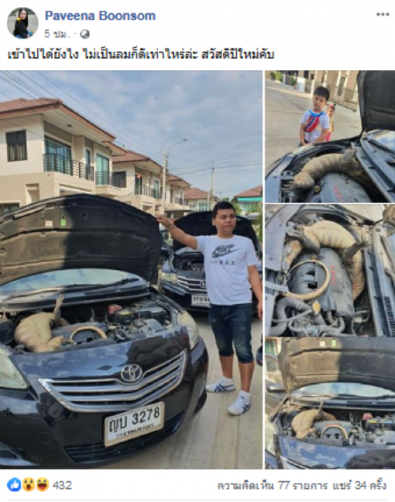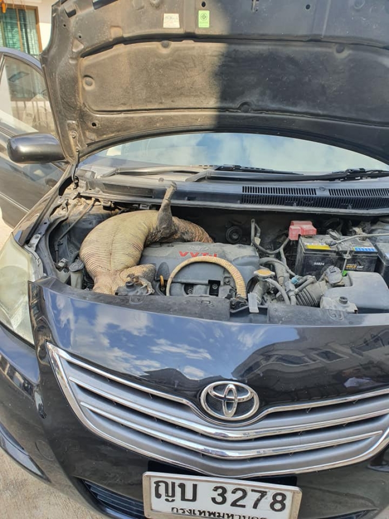 เรียกได้ว่าเป็นเหตุการณ์ที่มีคนต่างเข้ามาแสดงความคิดเห็นกันเป็นจำนวนมาก เมื่อครอบครัวหนึ่งกำลังจะเดินทางไปเที่ยว ได้ทำการเปิดฝากระโปรงเช็คสภาพรถ เครื่องยนต์ให้พร้อมใช้งาน เเต่เมื่อเปิดมาถึงกับงงหนัก หลังเจอตัวใหญ่มุดคาอยู่ เเต่เจ้าตัวนี้มันเข้าไปได้อย่างไร ตัวมันขนาดใหญ่มา ช่องในห้องเครื่องก็มีนิดเดียว