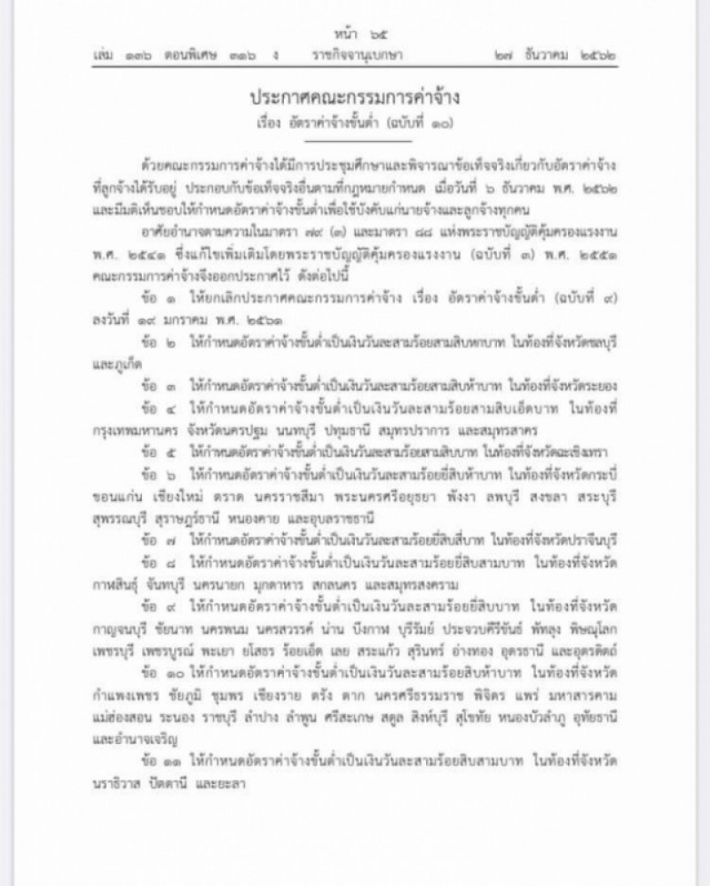 มีผลแล้ววันนี้สำหรับการประกาศขึ้นค่าแรงทั่วประเทศ เมื่อวันที่ 27 ธันวาคม เว็บไซต์ราชกิจจานุเบกษา เผยแพร่ประกาศคณะกรรมการค่าจ้าง เรื่อง อัตราค่าจ้างขั้นต่ำ ฉบับที่ 10 ตามที่คณะกรรมการค่าจ้างได้มีการประชุมศึกษาและพิจารณาข้อเท็จจริงเกี่ยวกับอัตราค่าจ้างที่ลูกจ้างได้รับอยู่ ประกอบกับข้อเท็จจริงอื่นตามกฎหมายกำหนด เมื่อวันที่ 6 ธันวาคม พุทธศักราช 2562 และมีมติเห็นชอบให้กำหนดอัตราค่าจ้างขั้นต่ำเพื่อใช้บังคับแก่นายจ้างและลูกจ้างทุกคน