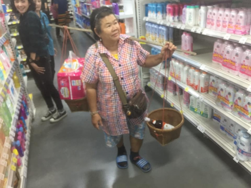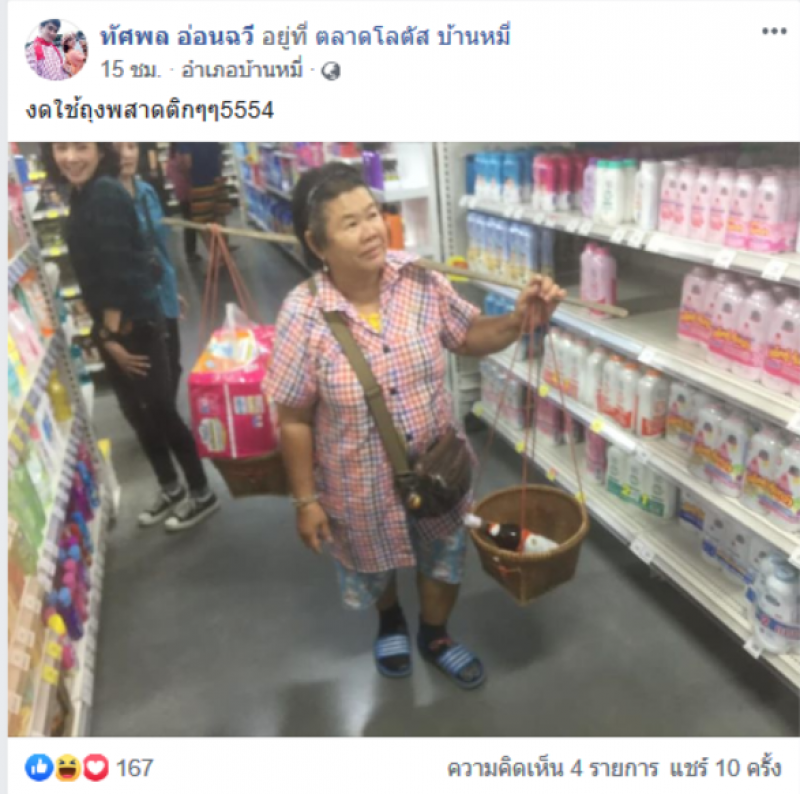 เรียกได้ว่าเป้นอีกหนึ่งภาพที่โซเชียลเข้ามาแสดงความเห็นกันเป็นจำนวนมาก หลังมีผู้ใช้เฟสบุ๊คชื่อ ทัศพล อ่อนฉวี ได้ออกมาโพสต์ถาพคุณป้าท่านหนึ่ง หาบกระบุงที่เป็นผลิตภัณฑ์ชุมชนไปใส่สินค้าที่จับจ่ายในโลตัส สาขาบ้านหมี่ แทนการใส่ถุงพลาสติก พร้อมทั้งได้ระบุข้อความว่า