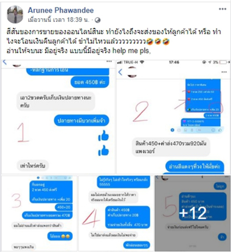 จากกรณีผู้ใช้เฟซบุ๊ค Arunee Phawandee ได้มีการโพสต์ภาพแชทสนทนาระหว่างตัวเองกับลูกค้า ที่เรียกได้ว่าอ่านแล้วปวดสมองไปตามๆกัน โดยผู้โพสต์ระบุว่า สีสันของการขายของออนไลน์สินะ ทำยังไงถึงจะส่งของให้ลูกค้าได้ หรือ ทำไงจะโอนเงินคืนลูกค้าได้ ขำไม่ไหวแล้ววววววววว อ่านให้จบนะ มีอยู่จริง แบบนี้มีอยู่จริง help me pls พี่เขาให้เลขบช มา เรานี่รีบเอาเงินส่วนตัวโอนเลยจ้าา แต่ข้อความแรกที่ทักมา รอสินค้าครับผม โอ้ยยย สาบานว่าเรื่องจริง ไม่เฟค ไม่เตี๊ยม บ่โปรโมท บ่อีหยังทั้งสิ้นจ้า เกือบโดนจับละเนาะ