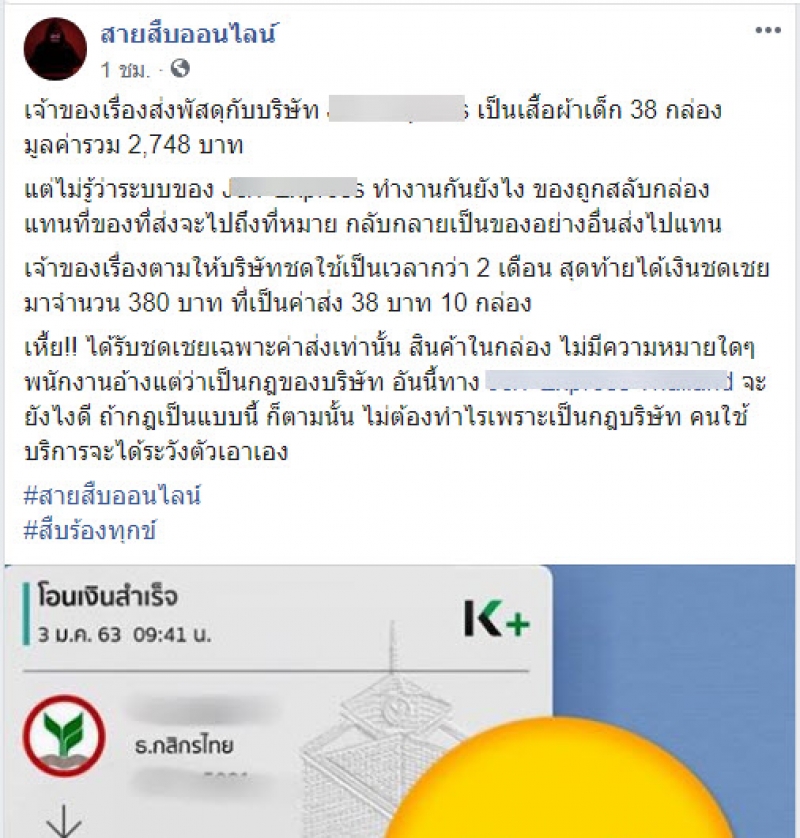 เีัยกได้ว่าเป้นอีกหนึ่งเรื่องราวี่โซเชียลเข้ามาแสดงความเห็นกันเป็นจำนวนมาก หลังมีผู้ใช้เฟสบุ๊คชื่อ สายสืบออนไลน์ ได้ออกมาเผยเรื่องราวของเจ้าของร้านเสื้อผ้าออนไลน์ ส่งของกับบริษัทขนส่งชื่อดัง แต่ของกลับถูกสลับ ก่อนจะได้รับการรับผิดชอบแค่ค่าส่ง โดยทางเพจได้ระบุว่า