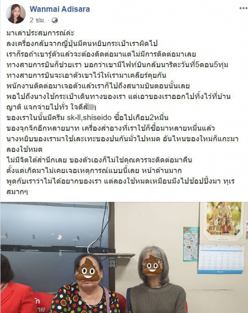 เรียกได้ว่าเป็นอีกหนึ่งเรื่องราวที่โซเชียลเข้ามาแสดงความเห็นกันเป็นจำนวนมาก หลังมีผู้ใช้เฟสบุ๊คชื่อ Wanmai Adisara ได้ออกมาโพสต์เรื่องราวผ่านเฟสบุ๊คส่วนตัว พร้อมทั้งได้ระบุข้อความว่า ลงเครื่องกลับจากญี่ปุ่นมีคนหยิบกระเป๋าเราผิดไป เราก็รอถ้าเขารู้ตัวแล้วจะต้องติดต่อมาแต่ไม่มีการติดต่อมาเลย ทางสายการบินก็ช่วยเรา บอกว่าเขามีไฟท์บินกลับนาริตะวันที่5ตอน5ทุ่มทางสายการบินจะเอาตัวเขาไว้ให้เรามาเคลียร์คุยกัน