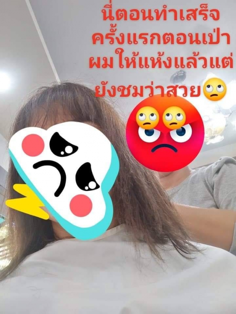 สักแปปเจ้าของร้านมาถึงบอกทำสีด้วยเลยก็ได้ ไอเราก็เนอะเชื่อใจเจ้าของร้าน ก็ลงมือทำ ทำเสร็จอีบร้าา ใจเราตก ผมชั้ลชอร์ตเสีย เจ้าของร้านก็ยังจะเชยชมกับลูกน้องว่า สวย ก็โอเคเนอะ นี่นึกอยู่ในใจสวย อะไร ผมพัง สักพักเราก็ไม่โอเคอยากจะร้องไห้ ก็เลยบอกกับเจ้าของร้านว่าเราไม่โอเคเลย เสียเงินตั้ง 5500 นะพี่