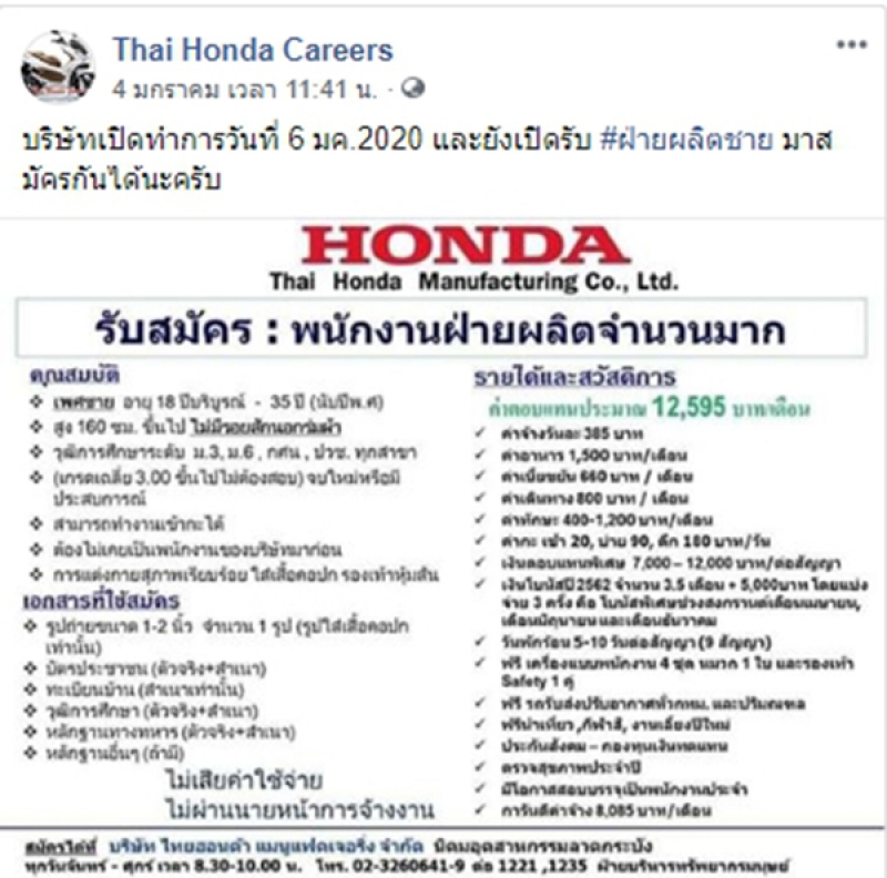 ช่วงนี้ต้องบอกเลยว่าหลายๆโรงงานหลายๆบริษัทนั้น ประกาศเลิกจ้าง พนักงานเป็นจนำวนมาก ล่าสุดเมื่อวันที่ 4 มกราคม 63 ที่ผ่านมา ทางเพจ Thai Honda Careers ได้มีการโพสต์ประกาศรับสมัครงาน โดยทางเพจระบุว่า บริษัทเปิดทำการวันที่ 6 มค.2020 และยังเปิดรับ ฝ่ายผลิตชาย มาสมัครกันได้นะครับ
