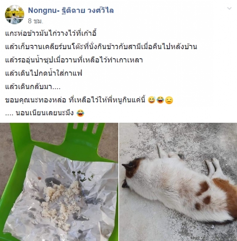 เป็นอีกหนึ่งเรื่องราวที่โซเชียลเข้ามาแสดงความเห็นกันเป็นจำนวนมาก หลังมีผู้ใช้เฟสบุ๊คชื่อ Nongnu ฐิติฉาย วงศ์วิไล ได้ออกมาโพสต์ภาพพร้อมทั้งได้ระบุข้อความว่า กะห่อข้าวมันไก่วางไว้ที่เก้าอี้ แล้วเก็บจานเคลียร์บนโต๊ะที่นั่งกินข้าวกับสามีเมื่อคืนไปหลังบ้าน แล้วรออุ่นน้ำซุปเมื่อวานที่เหลือไว้ทำเกาเหลา แล้วเดินไปกดน้ำใส่กาแฟ แล้วเดินกลับมา ขอบคุณนะทองหล่อ ที่เหลือไว้ให้พี่หนูกินแค่นี้ นอนเนียนเลยนะ