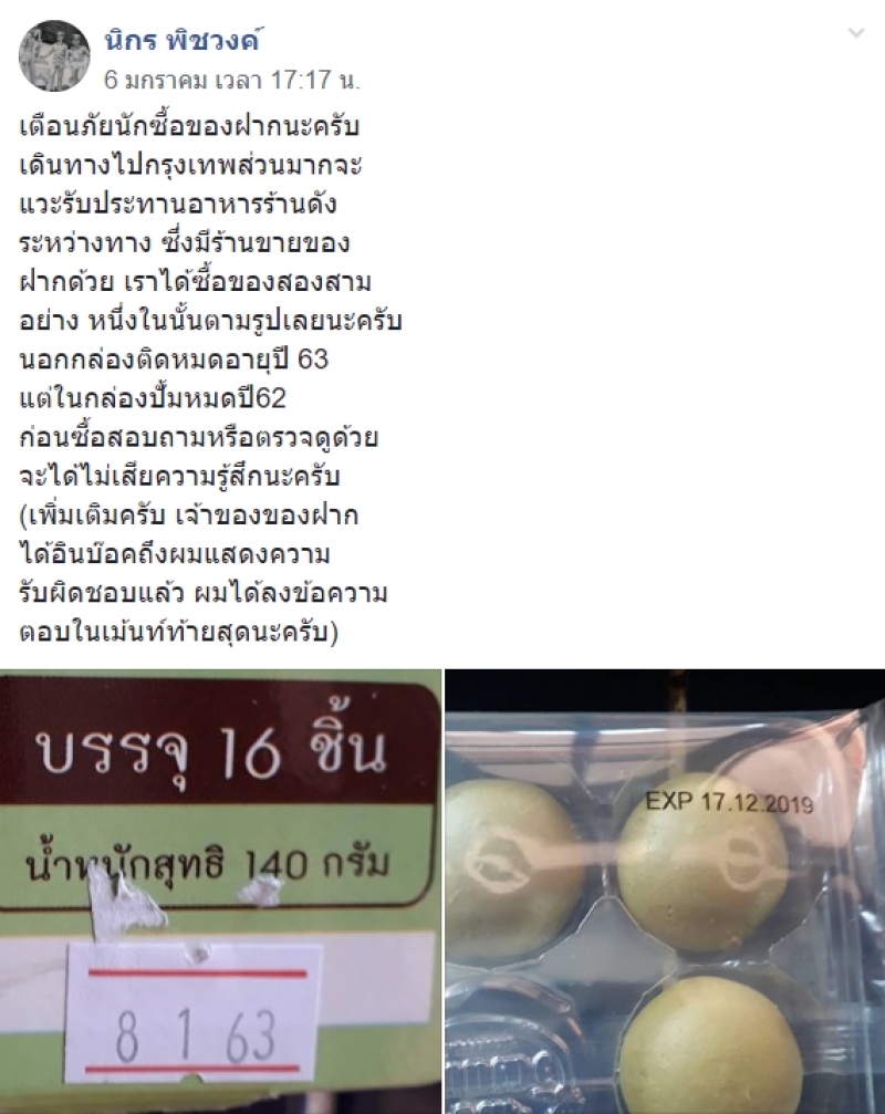 ตือนภัยนักซื้อของฝากนะครับ เดินทางไปกรุงเทพส่วนมากจะ แวะรับประทานอาหารร้านดัง ระหว่างทาง ซึ่งมีร้านขายของ ฝากด้วย เราได้ซื้อของสองสามอย่าง หนึ่งในนั้นตามรูปเลยนะครับ นอกกล่องติดหมดอายุปี 63 แต่ในกล่องปั้มหมดปี 62 ก่อนซื้อสอบถามหรือตรวจดูด้วย จะได้ไม่เสียความรู้สึกนะครับ เพิ่มเติมครับ เจ้าของของฝากได้อินบ๊อคถึงผมแสดงความ รับผิดชอบแล้ว ผมได้ลงข้อความตอบในเม้นท์ท้ายสุดนะครับ