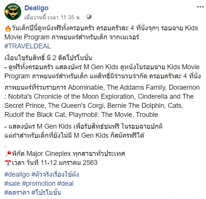 เรียกได้ว่าเป็นอีกหนึ่งข่าวดีให้กับหนูน้อยทุกคนโดยล่าสุดนั้นได้มีข่าวดีสำหรับวันเด็กที่จะถึงในวันที่ 11 มกราคม นี้ ซึ่งตรงกับวันเสาร์ที่ 2 ของเดือนมกราคม ของทุกปี สำหรับคอหนังห้ามพลาดเด็ดขาด ดูฟรีทั้งครอบครัว เมื่อวันที่ 9 มกราคม 63 เพจ Dealigo ได้โพสต์ข้อความระบุว่า วันเด็กปีนี้ดูหนังฟรีทั้งครอบครัว ครอบครัวละ 4 ที่นั่ง รอบฉาย Kids Movie Program ภาพยนตร์สำหรับเด็ก จากเมเจอร์ TRAVELDEALเงื่อนไขรับสิทธิ์ มี 2 ดีลโปรโมชั่นดูฟรีทั้งครอบครัว แสดงบัตร M Gen Kids ดูหนังในรอบฉาย Kids Movie Program ภาพยนตร์สำหรับหนูน้อย