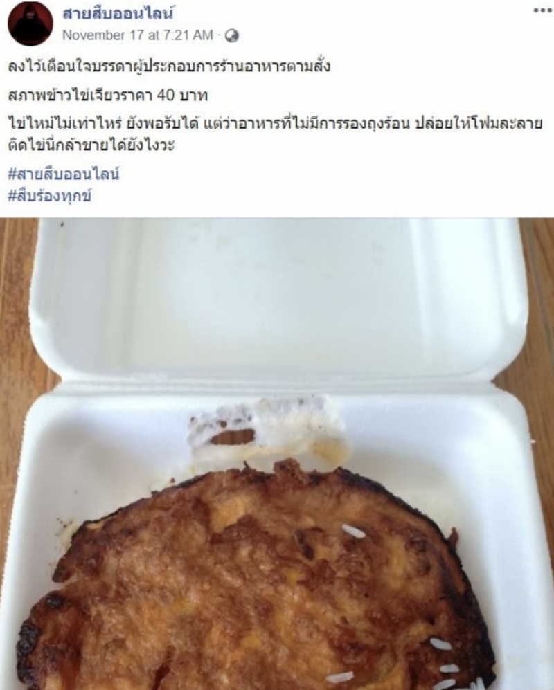 เป็นอีกหนึ่งเรื่องราวที่ดซเชียลเข้ามาแสดงความคิดเห็น และเข้ามาวิพากษ์วิจารณ์กันเป้นจำนวนมาก หลังมีผู้ใช้เฟสบุ๊คชื่อ สายสืบออนไลน์ ได้มีการโพสต์เตือนใจบรรดาผู้ประกอบการร้านอาหารตามสั่งทั้งหมาย ซึ่งเป็นภาพของข้าวไข่เจียวราคา 40 บาท ไข่ไหม้ไม่เท่าไหร่ ยังพอรับได้ แต่ว่าใส่อาหารโดยไม่รองด้วยถุงร้อน ปล่อยให้โฟมละลายติด ไข่ นี่กล้าขายได้ยังไง หลังเรื่องราวถูกเผยแพร่ออกไป โซเชียลเข้ามาแสดงความเห็นต่างๆนาๆ นอกจากโฟมจะทำลายสิ่งแวดล้อมแล้ว ไข่เจียวยังไหม้อีก แถมความร้อนระอุจนทำให้โฟมละลายอีกด้วย