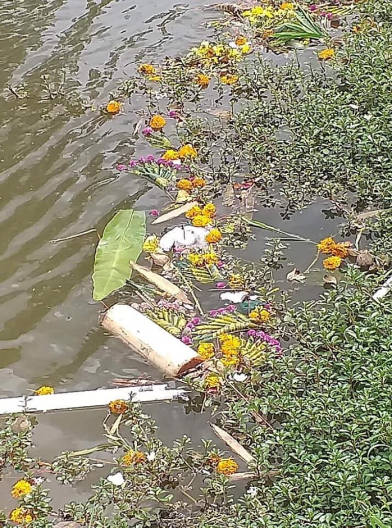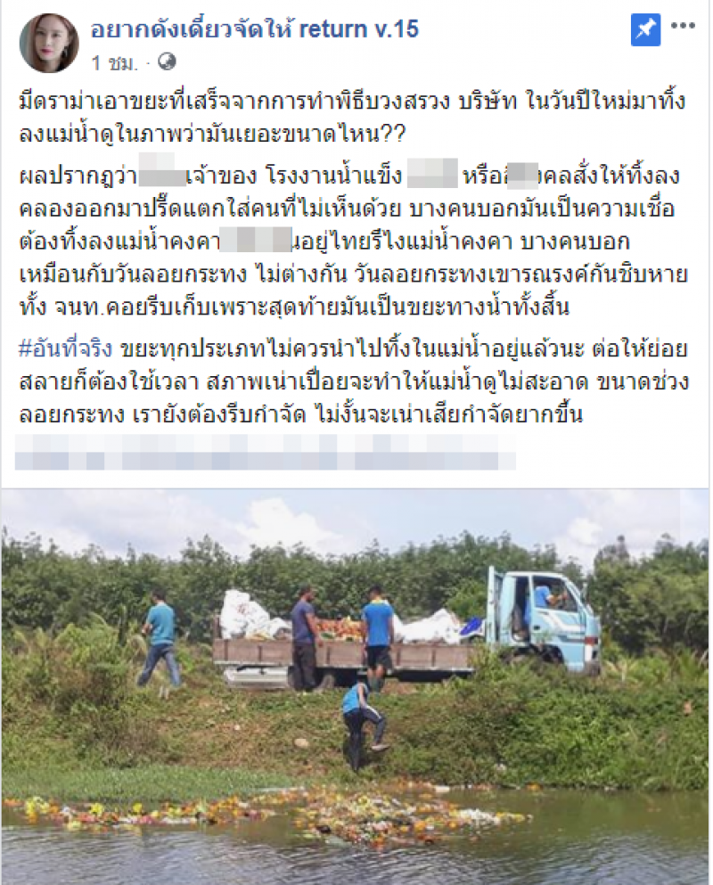 เอาขยะที่เสร็จจากการทำพิธีบวงสรวง บริษัท ในวันปีใหม่มาทิ้งลงแม่น้ำดูในภาพว่ามันเยอะขนาดไหนผลปรากฎว่เจ้าของ โรงงานน้ำแข็งหรือคนสั่งให้ทิ้งลงคลองออกมาปรี๊ดแตกใส่คนที่ไม่เห็นด้วย บางคนบอกมันเป็นความเชื่อต้องทิ้งลงแม่น้ำคงคามันอยู่ไทยรึไงแม่น้ำคงคา บางคนบอกเหมือนกับวันลอยกระทง ไม่ต่างกัน วันลอยกระทงเขารณรงค์กัน ทั้ง จนท.คอยรีบเก็บเพราะสุดท้ายมันเป็นขยะทางน้ำทั้งสิ้นอันที่จริง ขยะทุกประเภทไม่ควรนำไปทิ้งในแม่น้ำอยู่แล้วนะ ต่อให้ย่อยสลายก็ต้องใช้เวลา ทำให้แม่น้ำดูไม่สะอาด ขนาดช่วงลอยกระทง เรายังต้องรีบกำจัด ไม่งั้นจะเน่าเสียกำจัดยากขึ้น