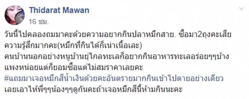 เรียกได้ว่าเป็นอีกหนึ่งเรื่องราวที่โซเชียลเข้ามาแสดงความเห็นกันเป็นจำนวนมาก หลังมีผู้ใช้เฟสบุ๊คชื่อ Thidarat Mawan ได้ออกมาโพสต์ภาพ พร้อมทั้งได้ระบุข้อความว่า วันนี้ไปคลองถมมาคะด้วยความอยากกินปลาหมึกสาย ซื้อมา2ถุงคะเสียความรู้สึกมากคะหมึกที่กินได้ก็เละ คนบ้านนอกอย่างหนูบ้านยุ่ไกลทะเลก็อยากกินอาหารทะเลอร่อยๆๆบ้างแพงหน่อยแต่ก็ยอมซื้อแต่ไม่สมราคาเลยคะ แถมมาเจอหมึกสีน้ำเงินด้วยคะอันตรายมากกินเข้าไป แอ๊กอย่างเดียว เลยเอาไห้พี่ๆๆน้องๆๆดูกันคะถ้าเจอหมึกสีนี้ห้ามกินนะคะ