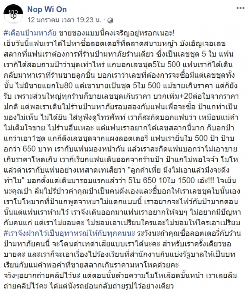 สาวโพสต์ ป้าขายลอตเตอรี่ 5ใบ 650 10ใบ 1500