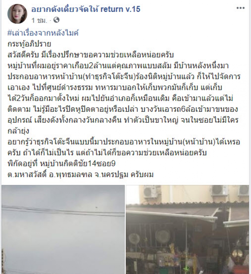 สวัสดีครับ มีเรื่องปรึกษาขอความช่วยเหลือหน่อยครับ หมู่บ้านที่ผมอยู่ราคาเกือบ2ล้านแต่คุณภาพแบบสลัม มีบ้านหลังหนึ่งมาประกอบอาหารหน้าบ้าน ทำธุรกิจโต๊ะจีน ร้องนิติหมู่บ้านแล้ว ก็ให้ไปจัดการเอาเอง ไปที่ศูนย์ดำรงธรรม ทหารมาบอกให้เก็บพวกมันก็เก็บ แต่เก็บได้ 2 วัน ก็ออกมาตั้งใหม่ ผมไปยันอำเภอก็เหมือนเดิม คือเข้ามาแล้วแต่ไม่ติดตาม ไม่รู้มีอะไรปิดหูปิดตาอยู่หรือเปล่า บางวันเอารถ 6 ล้อ เข้ามาขนของอุปกรณ์ เสียงดังทั้งกลางวันกลางคืน ทำตัวเป็นใหญ่ จนในซอยไม่มีใครกล้ายุ่ง