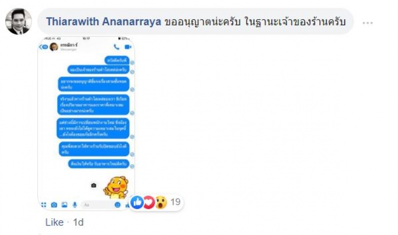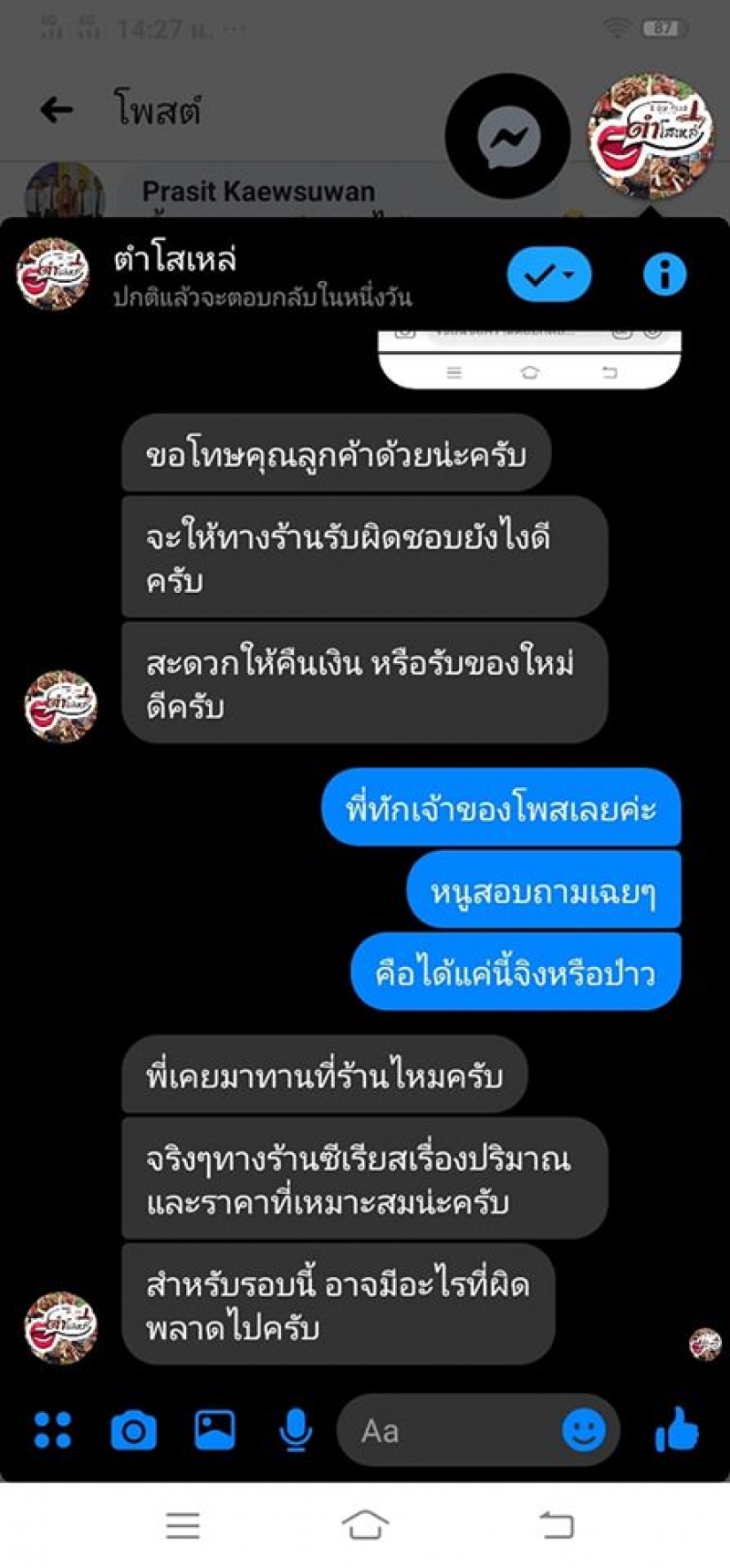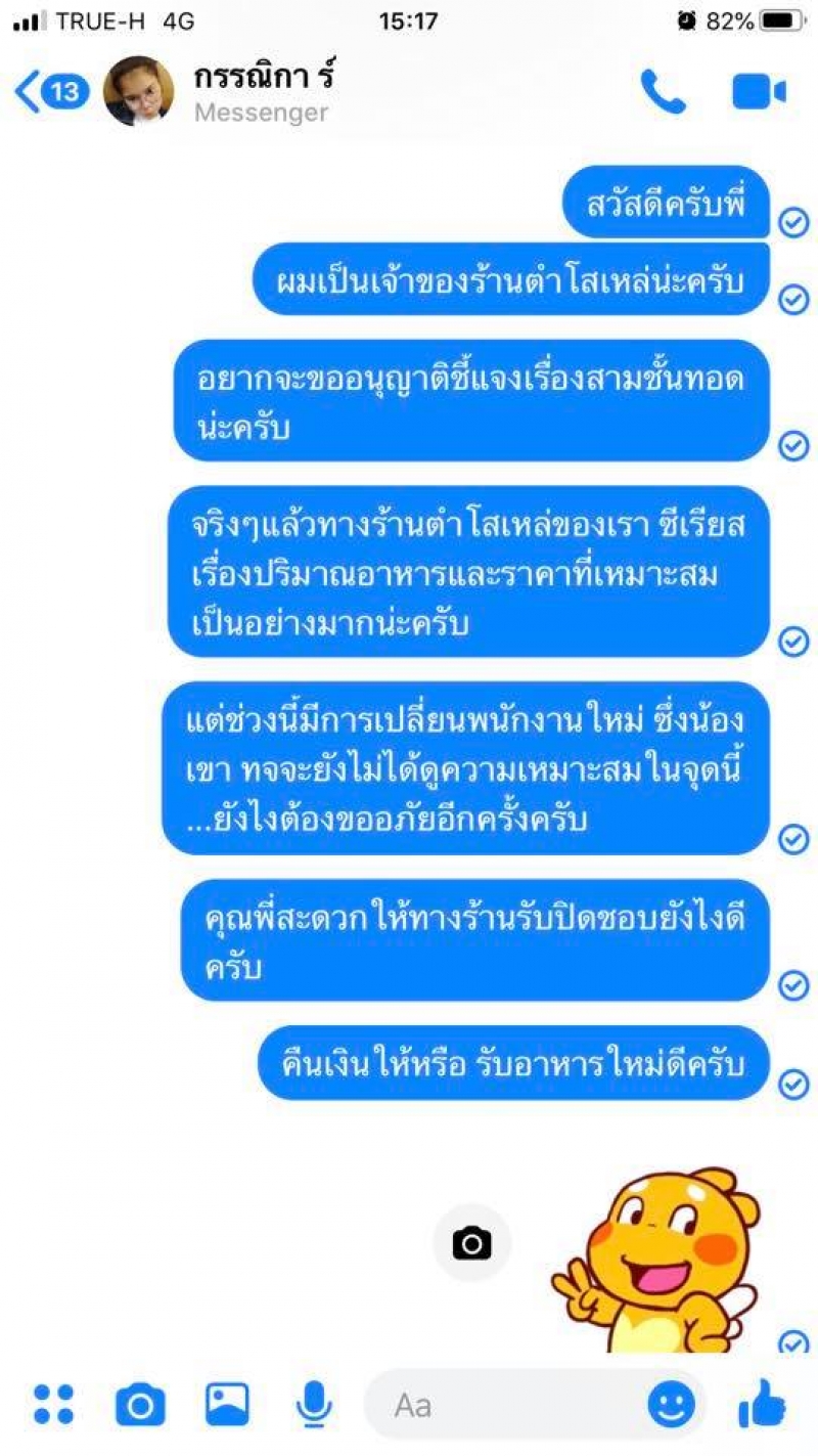 ล่าสุดนั้นทางเจ้าของร้านส้มตำโสเหล่คือผู้ใช้เฟซบุ๊ค Thiarawith Ananarraya ยังไงก็ต้องกราบขออภัยอีกครั้งน่ะครับ เป็นความผิดพลาดของทางร้านครับทางร้านยินดีรับผิดชอบครับผม