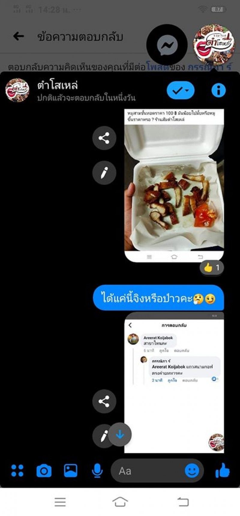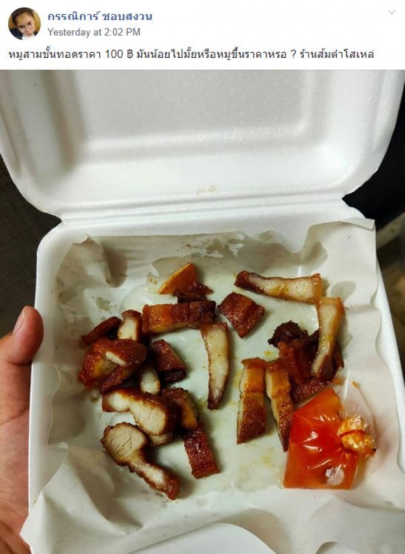 เป็นอีกหนึ่งเรื่องราวที่โซเชียลเข้ามาแสดงความคิดเห็นกันเป็นจำนวนมาก หลัง ผู้ใช้เฟซบุ๊ค กรรณิการ์ ชอบสงวน ได้โพสต์แชร์เรื่องราวที่ตนเองสั่งซื้ออาหาร ในกลุ่ม GRAB korat หมูสามชั้นทอดราคา 100 บาท ปริมาณ มันน้อยไปมั้ยหรือหมูขึ้นราคาหรอ ร้านส้มตำโสเหล่