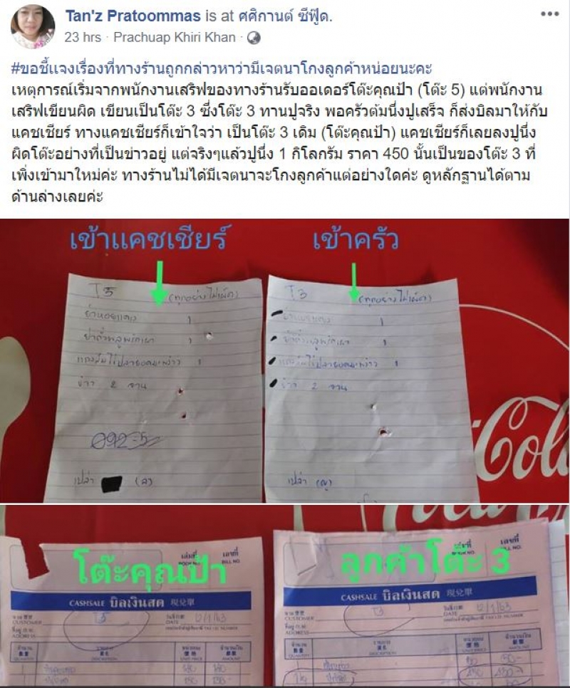 ขอชี้เเจงเรื่องที่ทางร้านถูกกล่าวหาว่ามีเจตนาโกงลูกค้าหน่อยนะคะ เหตุการณ์เริ่มจากพนักงานเสริฟของทางร้านรับออเดอร์โต๊ะคุณป้า โต๊ะ 5 แต่พนักงานเสริฟเขียนผิด เขียนเป็นโต๊ะ 3 ซึ่งโต๊ะ 3 ทานปูจริง พอครัวต้มนึ่งปูเสร็จ ก็ส่งบิลมาให้กับแคชเชียร์ ทางแคชเชียร์ก็เข้าใจว่า เป็นโต๊ะ 3 เดิม โต๊ะคุณป้า แคชเชียร์ก็เลยลงปูนึ่งผิดโต๊ะอย่างที่เป็นข่าวอยู่ แต่จริงๆแล้วปูนึ่ง 1 กิโลกรัม ราคา 450 นั้นเป็นของโต๊ะ 3 ที่เพิ่งเข้ามาใหม่ค่ะ ทางร้านไม่ได้มีเจตนาจะโกงลูกค้าแต่อย่างใดค่ะ ดูหลักฐานได้ตามด้านล่างเลยค่ะ