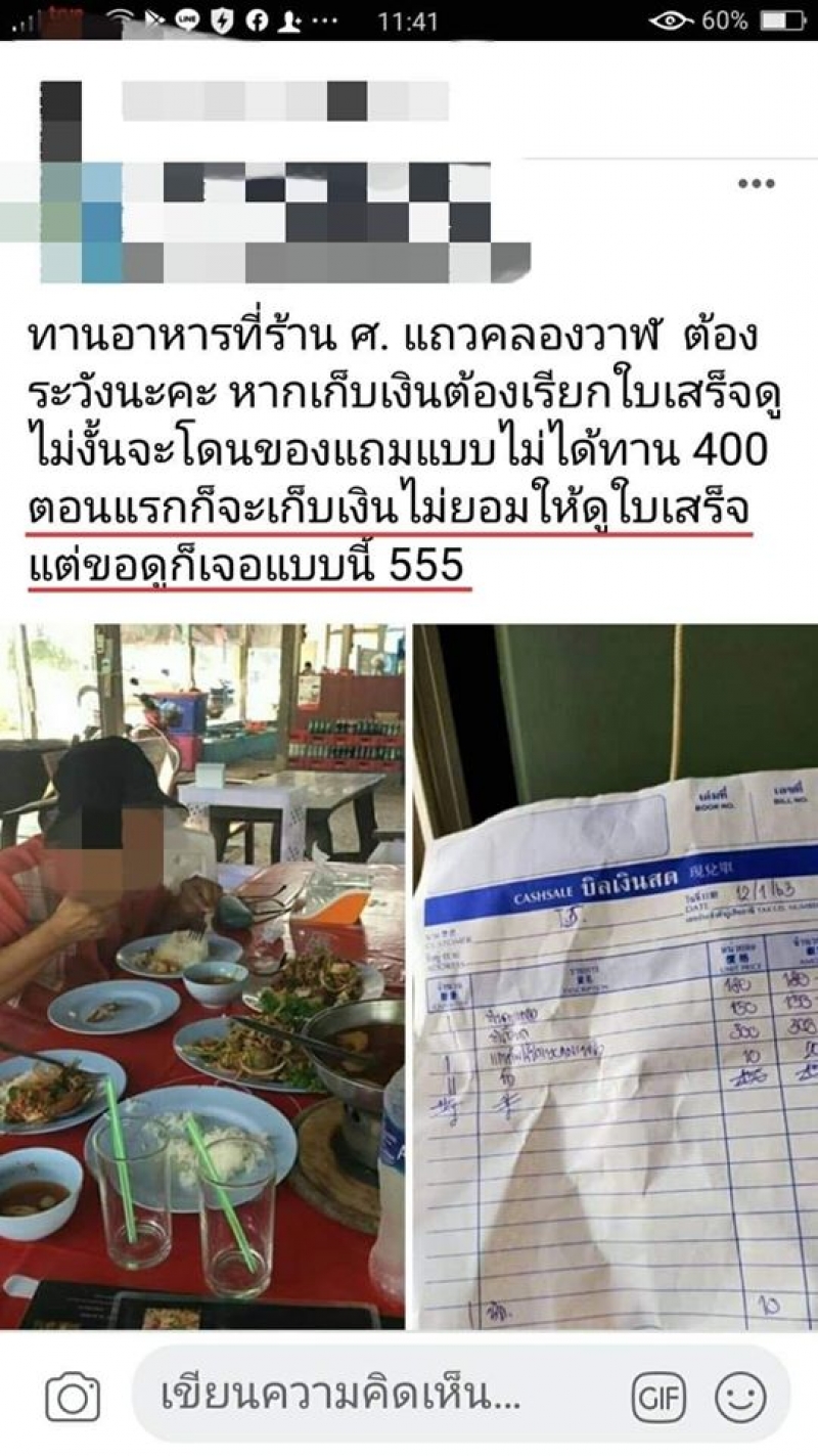 จากกรณีที่โซเชียลเข้ามาแสดงความเห็นกันเยอะมากๆ หลังมีผู้ใช้เฟสบุ๊คลายหนึงได้ออกมาโพสต์ภาพ ทานอาหารที่ร้าน ศ แถวคลองวาฬ ต้องระวังนะคะ หากเก็บเงินต้องเรียกใบเสร็จดูไม่งั้นจะโดนของแถมแบบไม่ได้ทาน 400 ตอนแรกก็จะเก็บเงินไม่ยอมให้ดูใบเสร็จแต่ขอดูก็เจอแบบนี้ 555