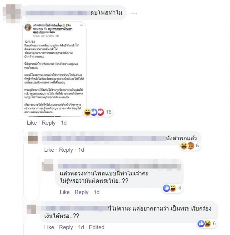 หลังจากที่เรื่องราวมีการเเชร์กันไปในวงกว้าง หลวงพ่อรูปดังกล่าวก็ได้เคลื่อนไหว ผ่านเฟซบุ๊คของท่านเอง ตอบโต้ญาติโยมที่เข้ามาถามว่า พระท่านลบโพสต์ไปทำไม ได้คำตอบมาว่า ฟังด่าพอแล้ว