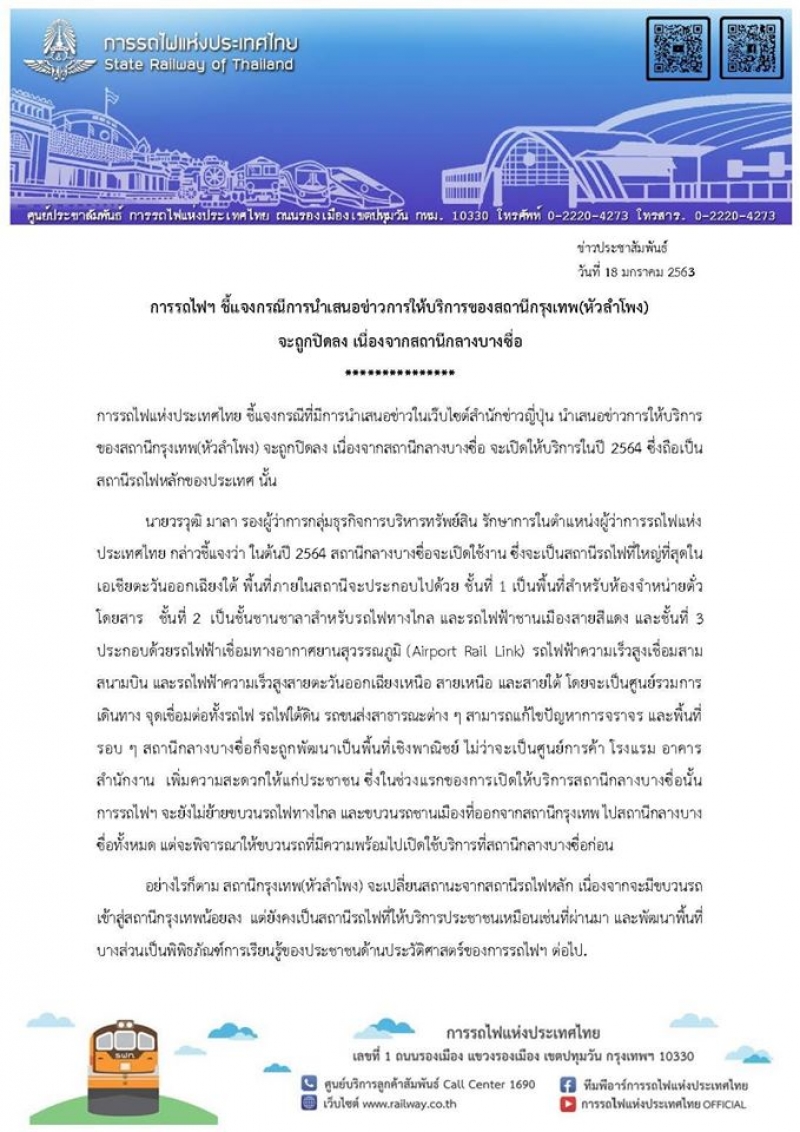 การรถไฟฯ ชี้แจงกรณีการนำเสนอข่าวการให้บริการสถานีกรุงเทพ หัวลำโพง จะถูกปิดลง เนื่องจากสถานีกลางบางซื่อ จะเปิดให้บริการในปี 2564 ตามที่มีข่าวในเว๊บไซต์สำนักข่าวญี่ปุ่น นำเสนอข่าวการให้บริการของสถานีกรุงเทพ หัวลำโพง จะถูกปิดลง เนื่องจากสถานีกลางบางซื่อ จะเปิดให้บริการในปี 2564 ซึ่งถือเป็นสถานีรถไฟหลักของประเทศ นั้น