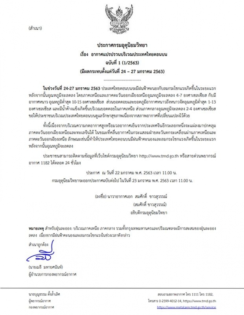 วันที่ 22 มค กรมอุตุฯ ได้เผยแพร่ประกาศกรมอุตุฯ อากาศแปรปรวนบริเวณประเทศไทยตอนบน มีผลกระทบตั้งแต่วันที่ 24 ถึง 27 มกราคม 2563 ฉบับที่ 1 ลงวันที่ 22 มกราคม 2563 ในช่วงวันที่ 24 ถึง 27 มกราคม 2563 ประเทศไทยตอนบนจะมีฝนฟ้าคะนองกับลมกระโชกแรงเกิดขึ้นในระยะแรก หลังจากนั้นอุณหภูมิจะลดลง