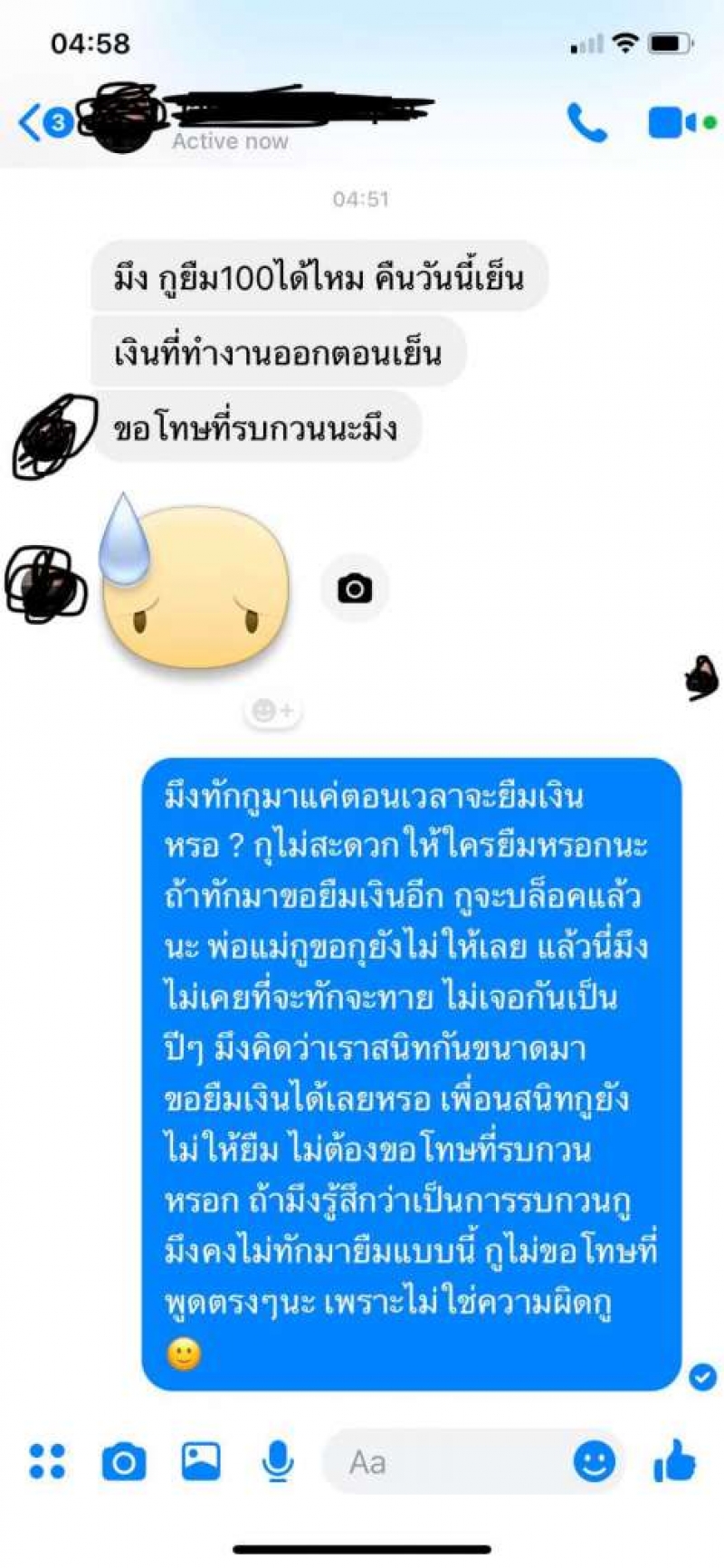ทักมาแบบนี้ 3 คนแล้วอาทิตย์นี้แล้วคนพวกนี้ก็ทักมาซ้ำแล้วซ้ำอีก จำไม่ได้หรอกว่าเคยสนิทกันไหมแต่ปัจจุบันไม่ได้สนิทกันสักนิดไม่สนหรอกนะว่าจะมีปัญหาอะไร เวลามีปัญหา นี่ก็ไม่เคยไปขอ อย่าเห็นว่าไปเที่ยว แล้วจะมีเงิน อย่าคิดว่าเงิน 100 เดียวจะใจดี ใจดีมากแล้ว ที่ปิดหน้าปิดชื่อให้ รายต่อไปก็ต้องขอเปิดหน้าหน่อย