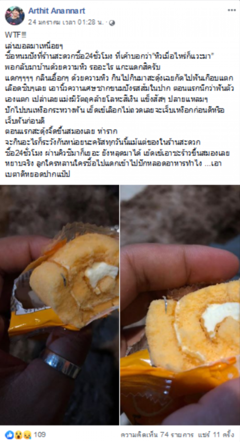 เรียกได้ว่าเป็นอีกหนึ่งเรื่องที่โซเชียลเข้ามาคอมเม้นท์ และวิพากษ์วิ จารณ์กันเป็นจำนวนมาก หลัง มีผู้ใช้เฟสบุ๊คชื่อ Arthit Anannart ได้ออกมาโพสต์ภาพ พร้อมเล่าว่า WTF เล่นบอลมาเหนื่อยๆ ซื้อหนมปังที่ร้านสะดวกซื้อ24ชั่วโมง ที่เค้าบอกว่า หิวเมื่อไหร่ก็แวะมา พอกลับมาบ้านด้วยความหิว รออะไร แกะกินสิครับกินๆๆๆๆ กลืนเอื้อกๆ ด้วยความหิว กินไปกินมาสะดุ้งเฉย ควานเศษ ขนมปังรสส้มในปาก