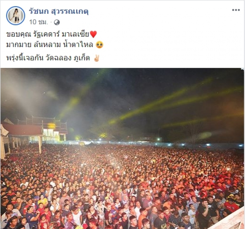 ล่าสุดทำเอาสาวเจนนี้นั้น น้ำตาไหลกันเลยทีเดียว โดยเจ้าตัวได้นำภาพตอนขึ้นแสดง พร้อมระบุว่า ขอบคุณ รัฐเคดาร์ มาเลเซีย มากมาย ล้นหลาม น้ำตาไหล พรุ่งนี้เจอกัน วัดฉลอง ภูเก็ต โดยในภาพจะเห็นว่ามีแฟนเพลงมาชมการแสดง ล้นหลามนับหมื่นคน