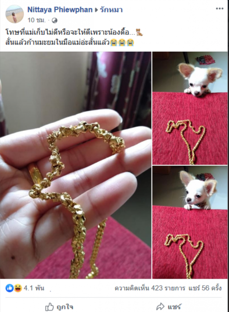 เรียกได้ว่ามเป็นอีกหนึ่งเรื่องราวที่โซเชียลเข้ามาแสดงความเห็นกันเยอะมากๆ หลังมีผู้ใช้เฟสบุ๊คชื่อ Nittaya Phiewphan ได้ออกมาโพสต์ภาพพร้อมทั้งได้ระบุข้อความว่า โทษที่แม่เก็บไม่ดีหรือจะให้ว่าน้อง เพราะน้องดื้อ สั่นแล้วก้านมะยมในมือแม่อ่ะสั่นแล้ว โดยสร้อยนั้นโดนเจ้าสุนัขสุดน่ารัก ทำนั่นเอง ทำเอาทองแม่ พังไม่เป็นม่าเลยนะ