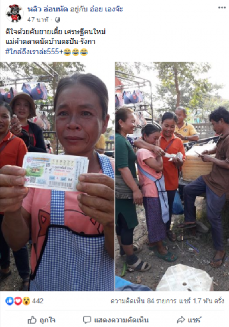 ต่อมาพบชาวบ้านถูกรางวับที่ 1 โดยมีเพจเฟสบุ๊คชื่อ หลิว อ่อนหัด เป็นแม่ค้าขายน้ำมะพร้าวอยู่ตลาดได้ออกมาโพสต์ภาพพร้อมได้ระบุข้อความว่า ดีใจด้วยคับยายเตี้ย เศรษฐีคนใหม่
