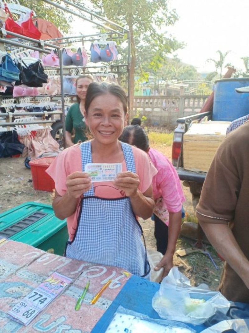 ซึ่งแม้ค้าที่ถูกรางวัลก็คือ ป้าต้อม เปิดเผยว่า ได้ซื้อลอตเตอรี่มาจากในตลาดนัดบ้านตะปันที่ไปขายของอยู่เป็นประจำ โดยได้ซื้อตัวเลขตามบ้านเลขที่ของตัวเองที่ฝันเห็น ในขณะที่ไปสูบน้ำจับปลา ซึ่งวันนี้ก็มาตั้งร้านขายปลาและน้ำมะพร้าวตามปกติ แต่เมื่อถึงเวลาประกาศผลก็พบว่าลอตเตอรี่ที่ซื้อไว้ตรงกับรางวัลที่ 1 ทำให้ทำอะไรไม่ถูก ร้องดีใจ หลังจากที่ลำบากมานาน ได้เงินจากลอตเตอรี่ครั้งนี้มาช่วยใช้หนี้สินและทำให้ชีวิตความเป็นอยู่ดีขึ้นเสียที