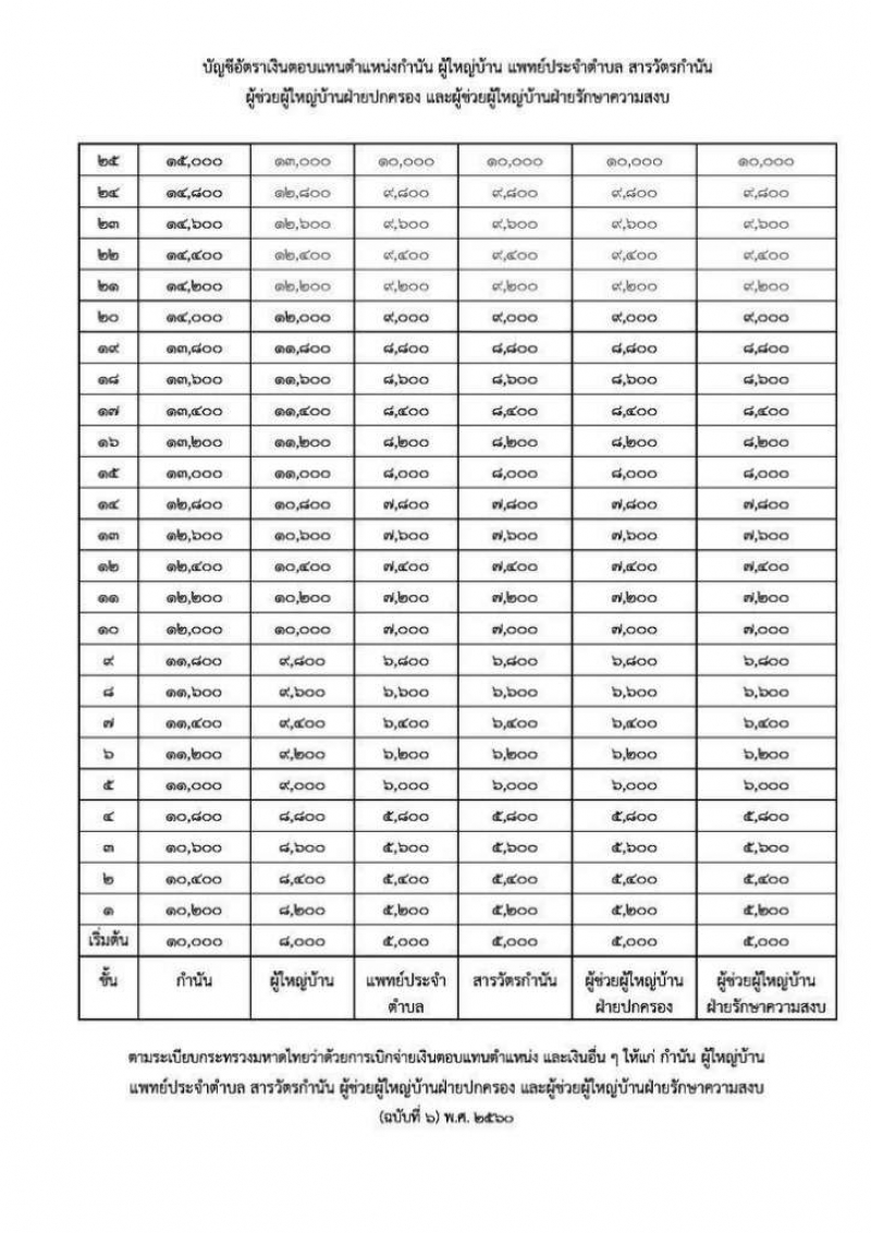 ตำแหน่ง และอื่นๆให้แก่ กำนัน ผู้ใหญ่บ้าน แพทย์ประจำตำบล สารวัตรกำนันผู้ช่วยผู้ใหญบ้านฝ่ายปกครอง และ ผู้ช่วยผู้ใหญ่บ้านฝ่ายรักษาความสงบ ฉบับที่ 6 พศ 2560 มีผลใช้บังคับตั้งแต่ ตค 2560 เป็นต้นไป