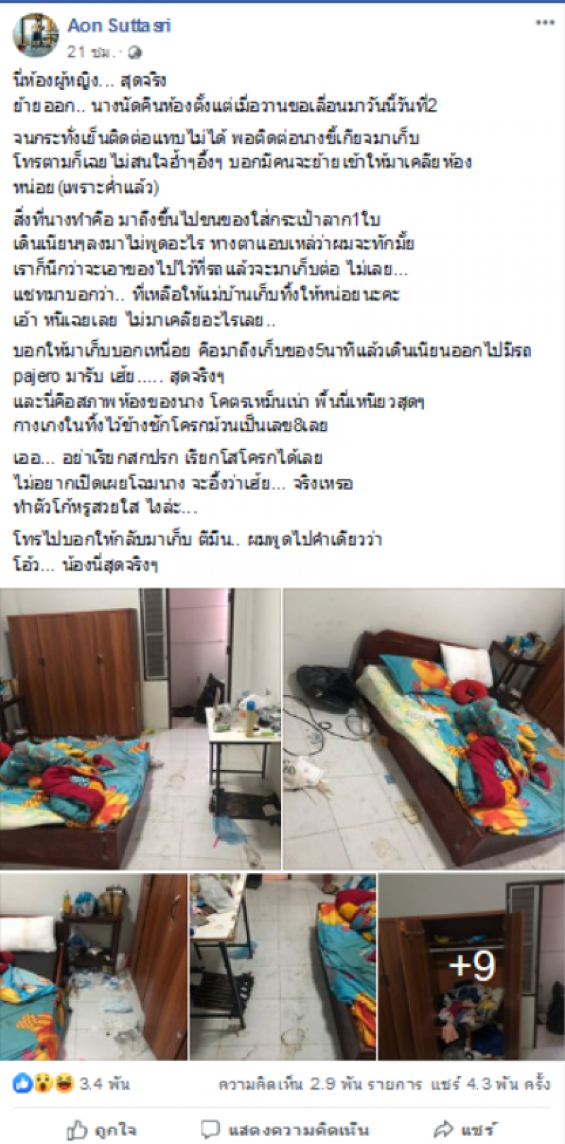 ซึ่งก่อนหน้านี้ผมบอกกับเขาไปว่า ถ้าไม่สะดวก พี่จะเข้าไปเก็บของให้ แล้วเราค่อยมาเอาของ เขาก็บอกว่าไม่เป็นไร เดี๋ยวหนูจะเข้ามาเอาเอง จากนั้น 10 นาที เขาก็มาที่หอพัก แล้วมาทักผมว่า หนูมาถึงแล้วนะคะ แล้วก็ขอถุงดำกับผม 2 ใบ เพื่อที่จะเอาไปเก็บของ แต่หลังจากนั้นประมาณ 5 นาที เขาเดินลงมาจากห้อง ลากกระเป๋าเดินทางใบเล็กๆ 1 ใบ เดินผ่านชำเลืองดูผม ค่อยๆ เดินออกไป แล้วก็มีรถมารับเขาขับออกไปเลย จากนั้นเขาก็แชทบอกผมว่า พี่คะของที่เหลือให้แม่บ้านเก็บไปทิ้งได้เลยนะคะ จากนั้นผมก็ขึ้นไปดูบนห้องพัก ก็เห็นภาพห้อง ตามที่ได้โพสต์ภาพลงไป นายชาย กล่าว