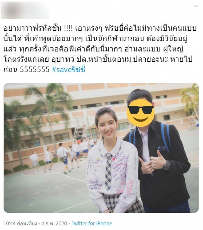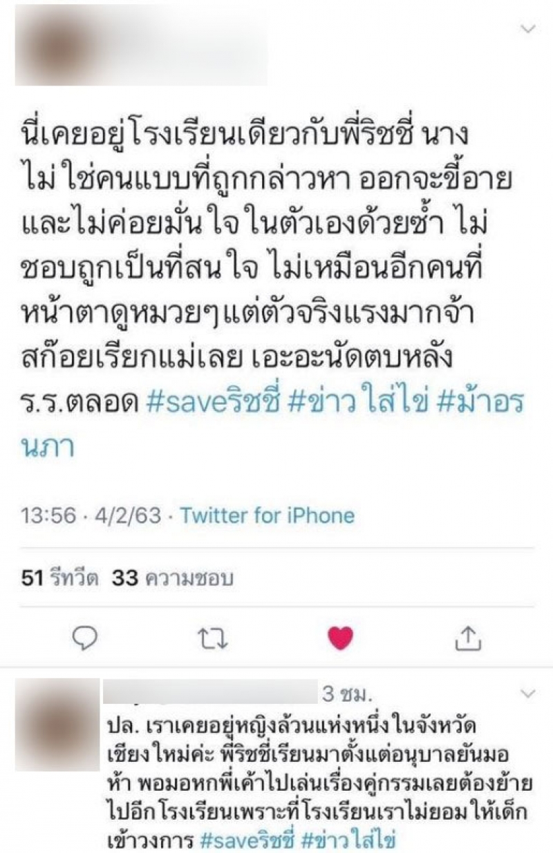 จากนั้นก็เกิดแฮชแท็ก saveริชชี่ ตามมา ล่าสุดมีสาวคนหนึ่งได้โพสต์เผยนิสัยที่แท้จริงของริชชี่ ว่า นี่เคยอยู่โรงเรียนเดียวกับริชชี่ นางไม่ใช่คนแบบที่ถูกกล่าวหา ออกจะขี้อายและไม่ค่อยมั่นใจในตัวเองด้วยซ้ำ ไม่ชอบถูกเป็นที่สนใจ